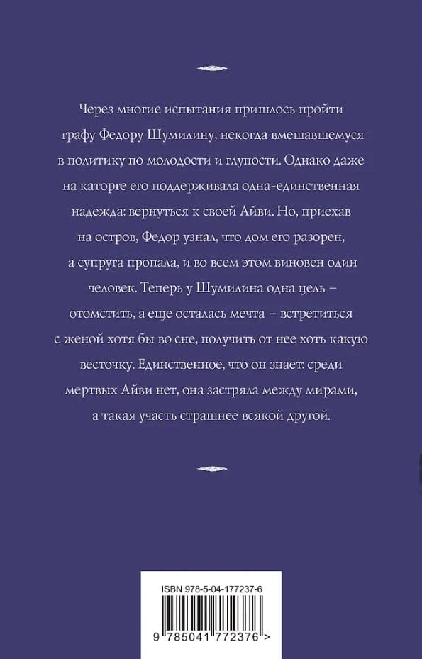 Через многие испытания пришлось пройти графу Федору Шумилину, некогда вмешавшемуся в политику по молодости и глупости. Однако даже на каторге его поддерживала одна-единственная надежда: вернуться к своей Айви. Но приехав на остров, Федор узнал, что дом его разорен, а супруга пропала, и во всем этом виновен один человек. Теперь у Шумилина одна цель — отомстить, а еще осталась мечта — встретиться с женой хотя бы во сне, получить от нее хоть какую весточку. Единственное, что он знает: среди мертвых Айви нет, она застряла между мирами, а такая участь страшнее всякой другой.