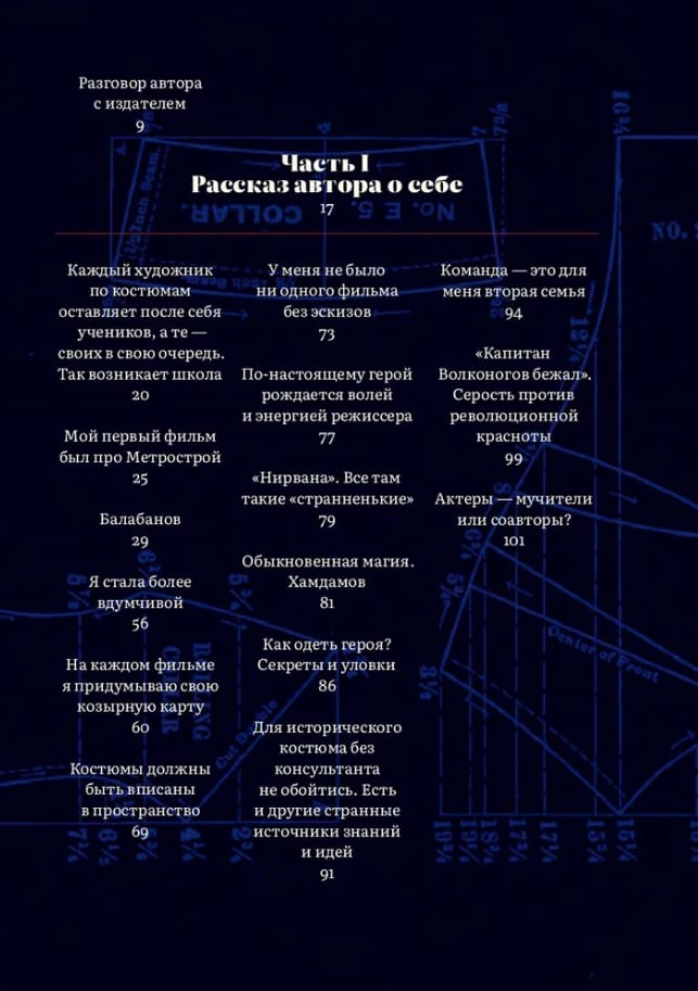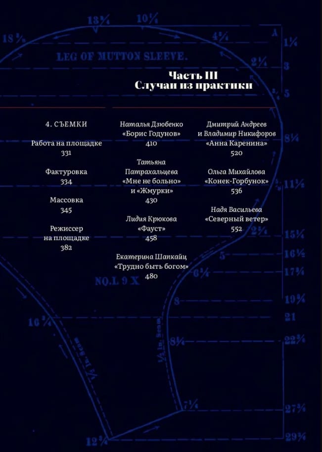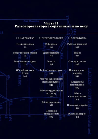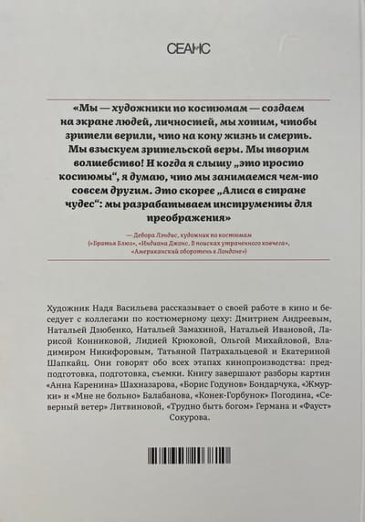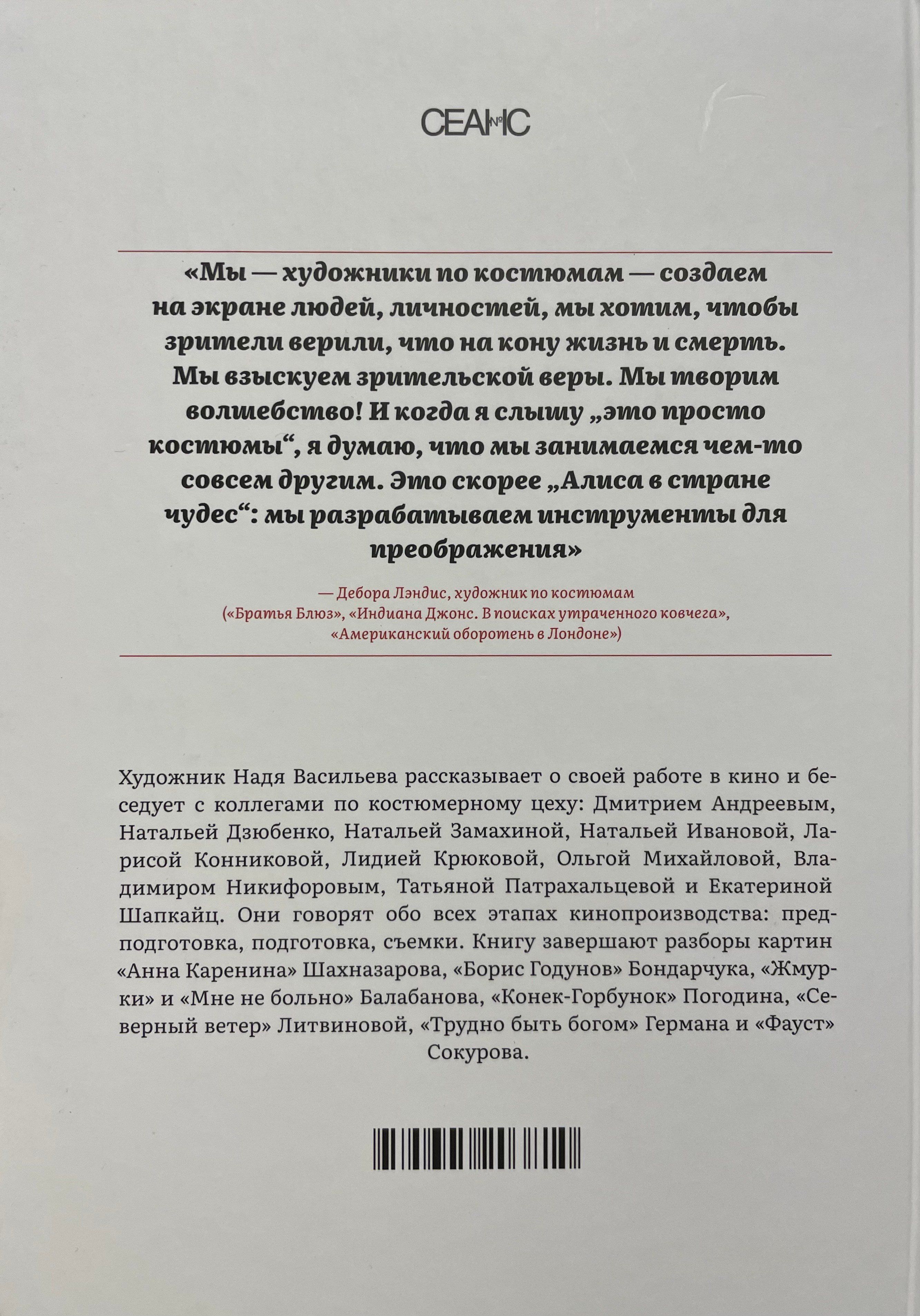 Надя Васильева — российский художник — рассказывает о своей работе в кино и беседует с десятью коллегами по костюмерному цеху: Дмитрием Андреевым, Натальей Дзюбенко, Натальей Замахиной, Натальей Ивановой, Ларисой Конниковой, Лидией Крюковой, Ольгой Михайловой, Владимиром Никифоровым, Татьяной Патрахальцевой и Екатериной Шапкайц. Их размышления о профессии собраны по разделам, соответствующим этапам кинопроизводства. Книгу завершают разборы отдельных картин: «Анна Каренина» Шахназарова, «Борис Годунов» Бондарчука, «Жмурки» и «Мне не больно» Балабанова, «Конек-Горбунок» Погодина, «Северный ветер» Литвиновой, «Трудно быть богом» Германа и «Фауст» Сокурова.