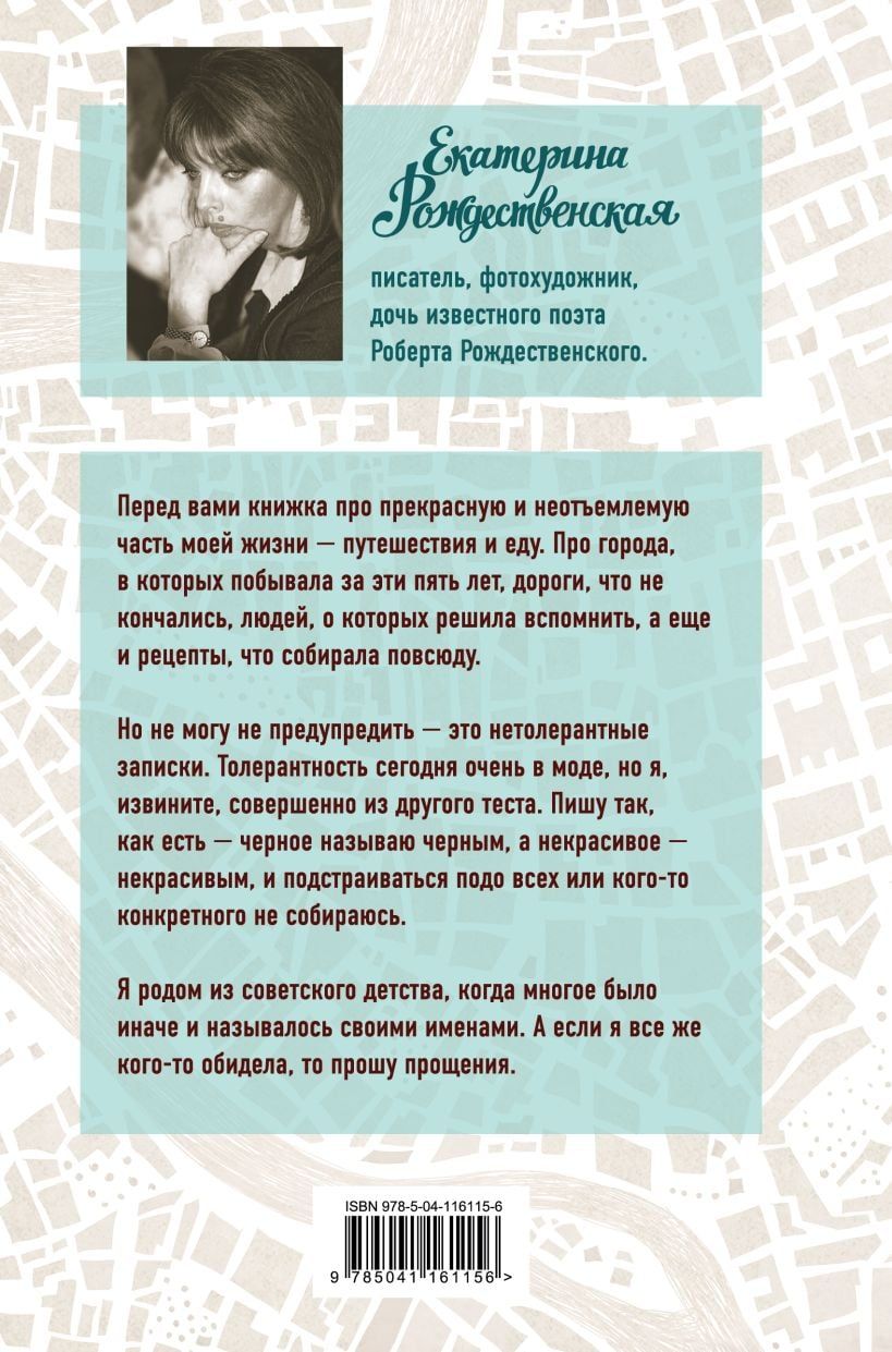 Перед вами книжка про прекрасную и неотъемлемую часть моей жизни — путешествия и еду. Про города, в которых побывала за эти пять лет, дороги, что не кончались, людей, о которых решила вспомнить, а еще и рецепты, что собирала повсюду. Но не могу не предупредить — это не толерантные записки. Толерантность сегодня очень в моде, но я, извините, совершенно из другого теста. Пишу так, как есть — черное называю черным, а некрасивое — некрасивым, и подстраиваться подо всех или кого-то конкретного не собираюсь. Я родом из советского детства, когда многое было иначе и называлось своими именами. А если я все же кого-то обидела, то прошу прощения.