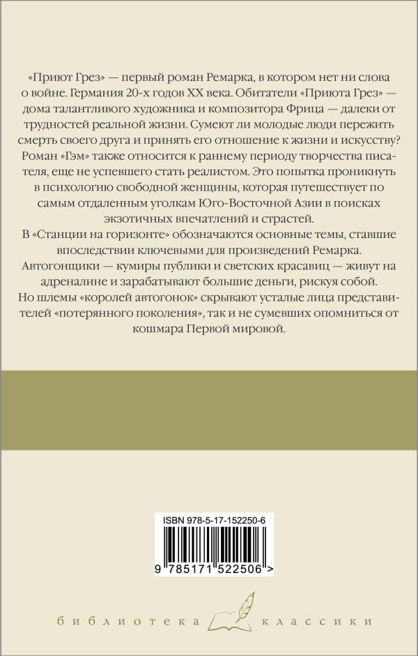 Приют Грез – первый роман Ремарка, в котором нет ни слова о войне. Германия 20-х годов ХХ века. Обитатели «Приюта Грез» – дома талантливого художника и композитора Фрица – далеки от трудностей реальной жизни. Сумеют ли молодые люди пережить смерть своего друга и принять его отношение к жизни и искусству? Роман «Гэм» также относится к раннему периоду творчества писателя, еще не успевшего стать реалистом. Это попытка проникнуть в психологию свободной женщины, которая путешествует по самым отдаленным уголкам Юго-Восточной Азии в поисках экзотичных впечатлений и страстей. В «Станции на горизонте» обозначаются основные темы, ставшие впоследствии ключевыми для произведений Ремарка. Автогонщики – кумиры публики и светских красавиц – живут на адреналине и зарабатывают большие деньги, рискуя собой. Но шлемы «королей автогонок» скрывают усталые лица представителей «потерянного поколения», так и не сумевших опомниться от кошмара Первой мировой.