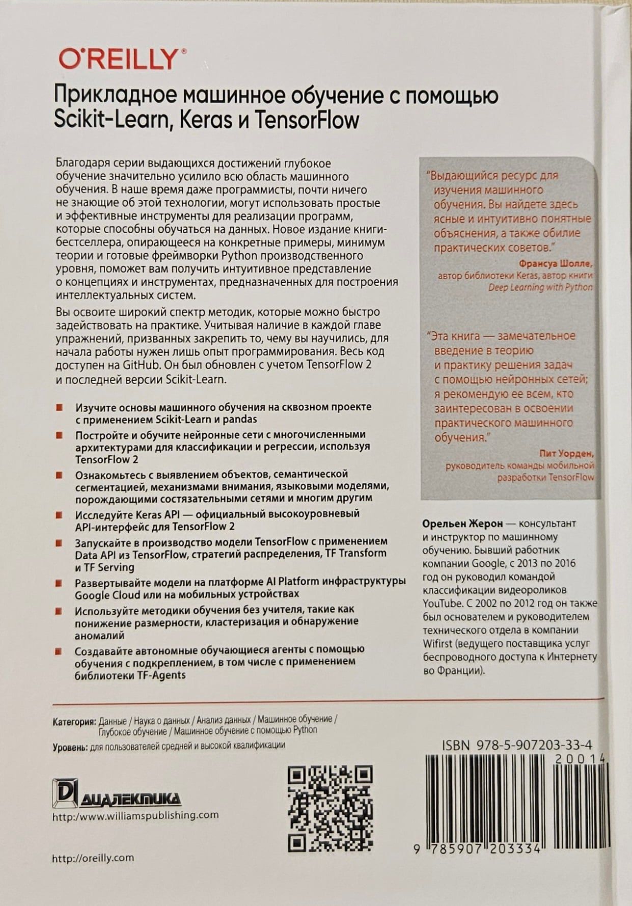 Вы освоите широкий спектр методик, которые можно быстро задействовать на практике. Учитывая наличие в каждой главе упражнений, призванных закрепить то, чему вы научились, для начала работы нужен лишь опыт программирования. Весь код доступен на GitHub. Он был обновлен с учетом TensorFlow 2 и последней версии Scikit-Learn.