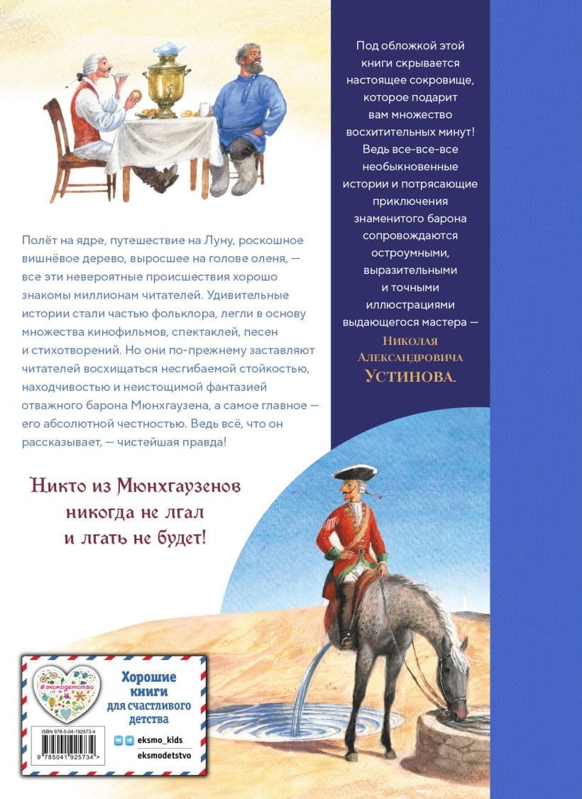 Как, вы всё ещё не верите? Тогда читайте самые правдивые на свете воспоминания барона Мюнхгаузена и рассматривайте восхитительные иллюстрации выдающегося иллюстратора Николая Устинова — и у вас не останется и тени сомнений!