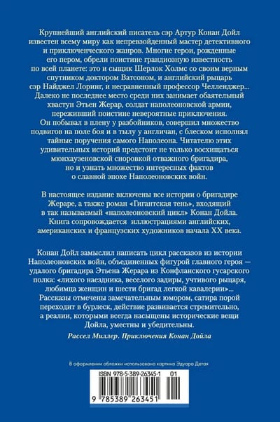 В настоящее издание включены все истории о бригадире Жераре, а также роман «Гигантская тень», входящий в так называемый «наполеоновский цикл» Конан Дойла. Книга сопровождается иллюстрациями английских, американских и французских художников начала XX века.