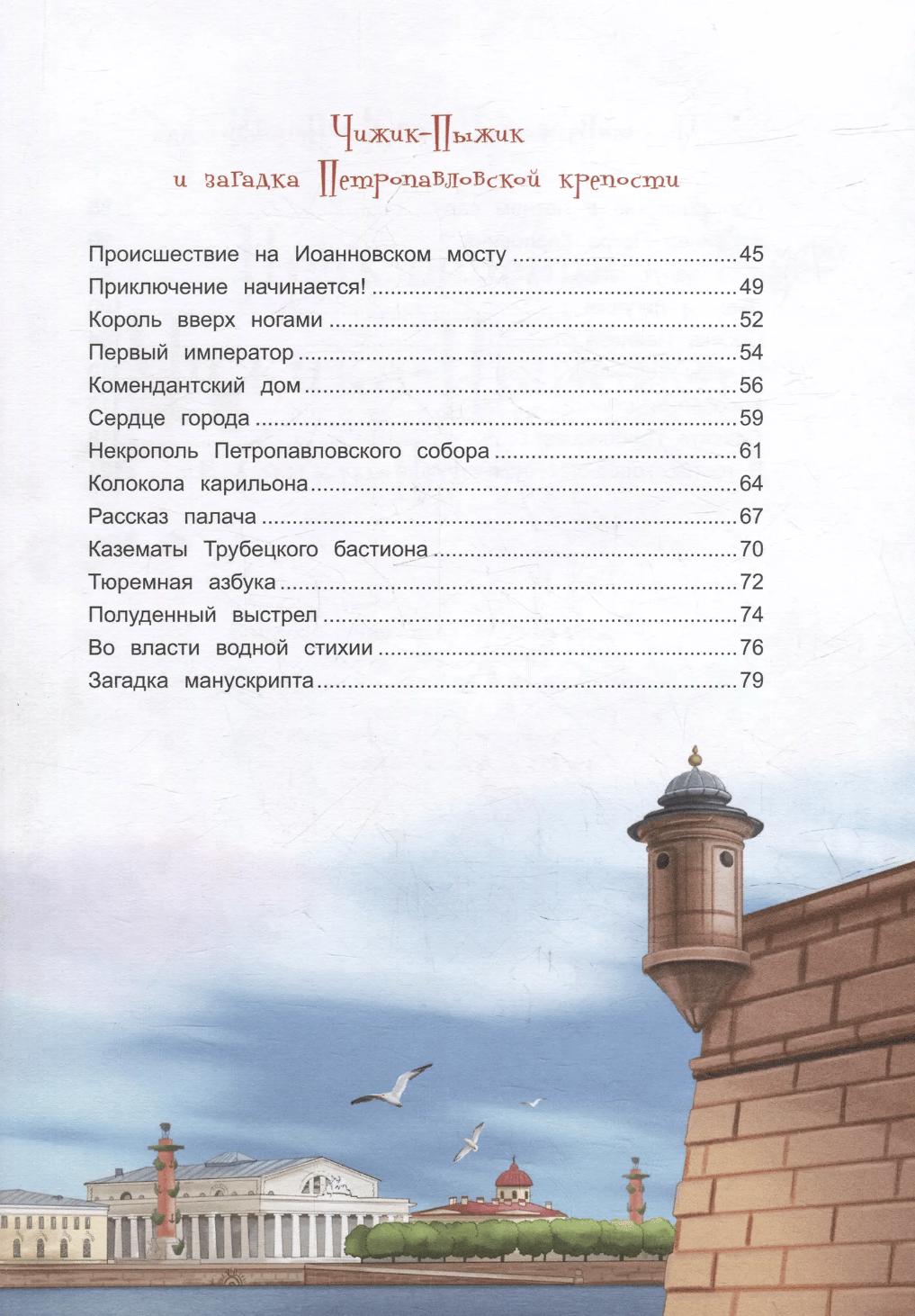 Неутомимый и любознательный Чижик-Пыжик приглашает вас в путешествие по Санкт-Петербургу. Вместе с ним вы познакомитесь с Петербургским Ангелом и другими хранителями города, прогуляетесь по Петропавловской крепости и раскроете загадку древнего манускрипта, среди тенистых аллей Летнего сада встретитесь с Иваном Андреевичем Крыловым и героями его басен, а также поучаствуете в настоящем детективном расследовании. И это только часть секретов Северной столицы, которые вам предстоит раскрыть на страницах этой книги.