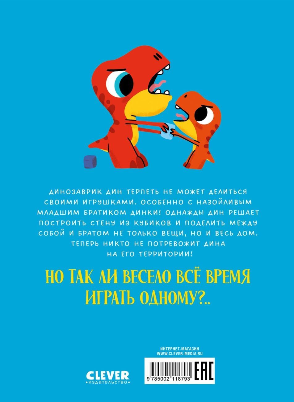 Книжка-картинка «‎Динозаврик Дин не хочет делиться!»‎ понравится маленьким читателям. В симпатичном эмоциональном герое — динозаврике — они легко узнают себя. Ведь всем детям не нравится, когда берут их вещи, когда младшие братья и сестры мешают играть. Динозаврик Дин не хотел, чтобы младший брат Динки брал его кубики. Но мама сказала играть вместе… Дин ворчал и прогонял брата. Все закончилось ссорой и кубиком, прилетевшим прямо на голову Дину. И тогда Дин решил построить стену, разделив с братом не только игрушки, но и весь дом. Но так ли весело играть одному? Вместе строить было бы веселее…