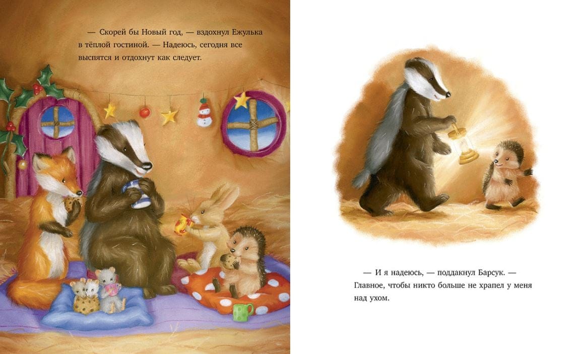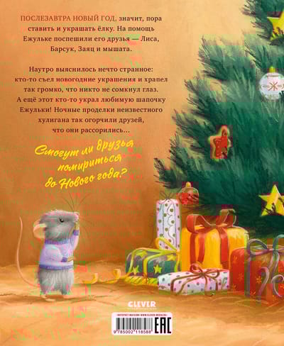 Послезавтра наступит Новый год, значит, пора ставить и украшать елку. На помощь Ежульке поспешили его друзья — Лиса, Барсук, Заяц и мышата. Наутро выяснилось нечто странное: кто‑то съел новогодние украшения и храпел так громко, что друзья не сомкнули глаз. А еще этот кто‑то украл любимую красную шапочку Ежульки! Ночные проделки неизвестного хулигана так огорчили друзей, что они рассорились. Успеют ли друзья помириться до Нового года?