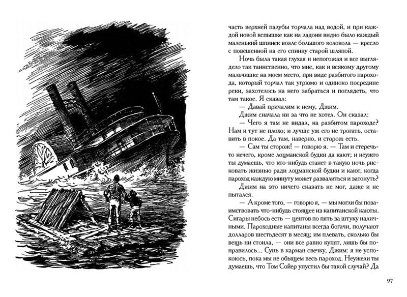 «Приключения Гекльберри Финна» — повесть, которая считается одним из наиболее значимых произведений Марка Твена. Остросюжетная история о похождениях беспризорника Гека Финна, пускающегося в опасное путешествие на пару с беглым чернокожим рабом Джимом, не просто захватывает внимание, но дает представление о нравах, царящих в Америке конца 1830-х — начала 1840-х годов. Свобода и справедливость, дружба и взаимопомощь, с одной стороны, и предрассудки и социальные условности, с другой, — такой по-настоящему взрослый выбор ставит перед своими героями автор книги, из которой, по словам другого знаменитого американского классика Эрнеста Хемингуэя, «вышла вся современная американская литература».