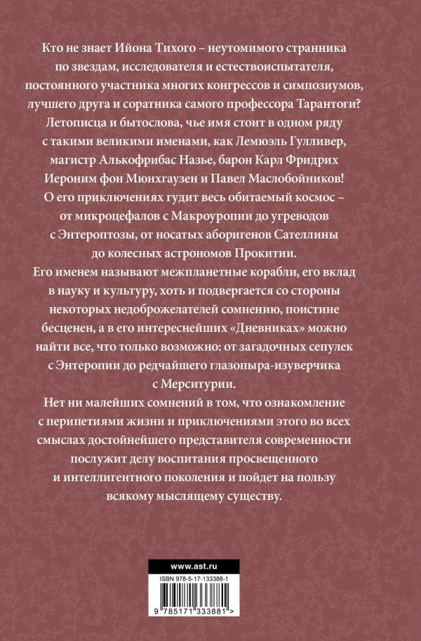 Кто не знает Ийона Тихого – неутомимого странника по звездам, исследователя и естествоиспытателя, постоянного участника многих конгрессов и симпозиумов, лучшего друга и соратника самого профессора Тарантоги? Летописца и бытослова, чье имя стоит в одном ряду с такими великими именами, как Лемюэль Гулливер, магистр Алькофрибас Назье, барон Карл Фридрих Иероним фон Мюнхгаузен и Павел Маслобойников!О его приключениях гудит весь обитаемый космос – от микроцефалов с Макроуропии до угреводов с Энтероптозы, от носатых аборигенов Сателлины до колесных астрономов Прокитии.Его именем называют межпланетные корабли, его вклад в науку и культуру, хоть и подвергается со стороны некоторых недоброжелателей сомнению, поистине бесценен, а в его интереснейших «Дневниках» можно найти все что только возможно: от загадочных сепулек с Энтеропии до редчайшего глазопыра-изуверчика с Мерситурии.Нет ни малейших сомнений в том, что ознакомление с перипетиями жизни и приключениями этого во всех смыслах достойнейшего представителя современности послужит делу воспитания просвещенного и интеллигентного поколения и пойдет на пользу всякому мыслящему существу.
