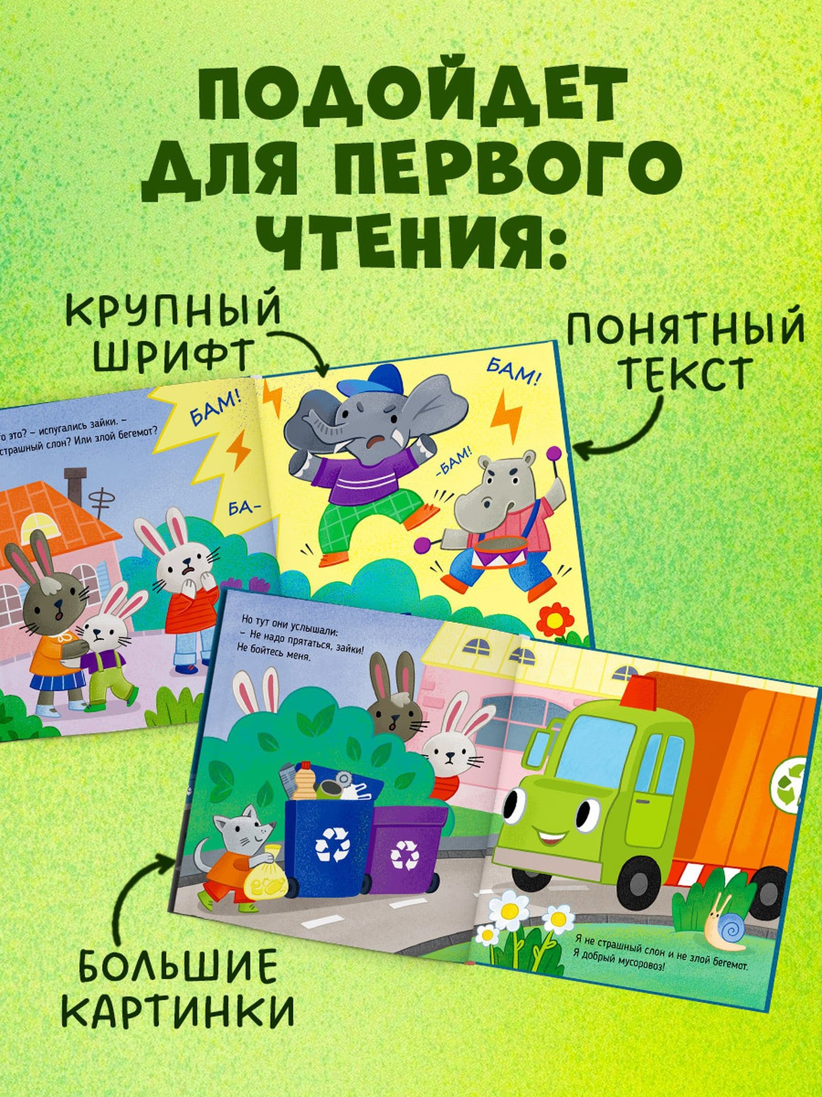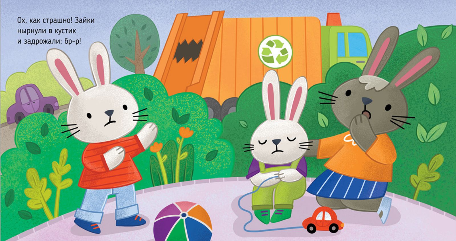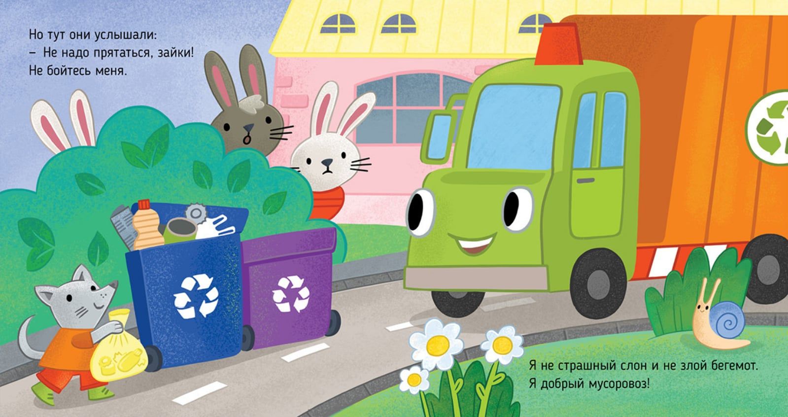 Зайчата играли во дворе, как вдруг услышали громкие звуки: «Бам-бам-бам!» Что это? — испугались зайчата. Может быть, это слон? Или злой бегемот? Но это оказалась машина — мусоровоз. Он убирает мусор и благодаря ему в городе всегда чисто.