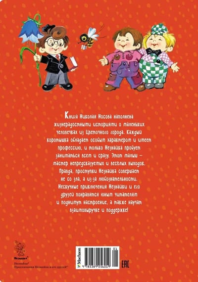 Книга Николая Носова наполнена жизнерадостными историями о маленьких человечках из Цветочного города. Каждый коротышка обладает особым характером и имеет профессию, и только Незнайка пробует заниматься всем и сразу. Этот малыш — мастер непредсказуемых и весёлых выходок. Правда, проступки Незнайка совершает не со зла, а из-за любознательности. Нескучные приключения Незнайки и его друзей понравятся юным читателям и поднимут настроение, а также научат взаимовыручке и поддержке!