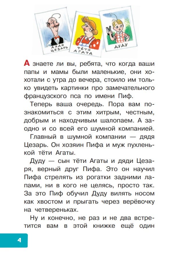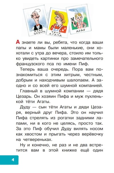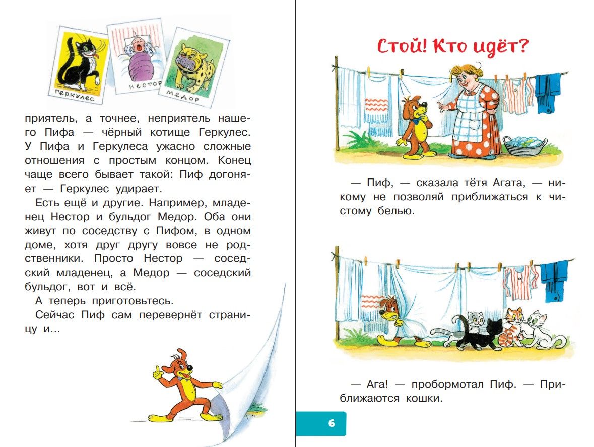 «Приключения Пифа» — это весёлые истории в картинках с короткими остроумными подписями. Давным-давно серия комиксов про пса Пифа появилась во Франции, а потом писатель Григорий Остер и художник Владимир Сутеев рассказали и нарисовали эти сюжеты по-своему. Пиф — добродушный, обаятельный пёс, всегда готов прийти на помощь и сделать всё по-честному. Но иногда он попадает впросак, чем ставит своих любимых хозяев, тётю Агату и дядю Цезаря, в тупик. Впрочем, сердятся они не долго, ведь Пиф лучший друг их сына!
