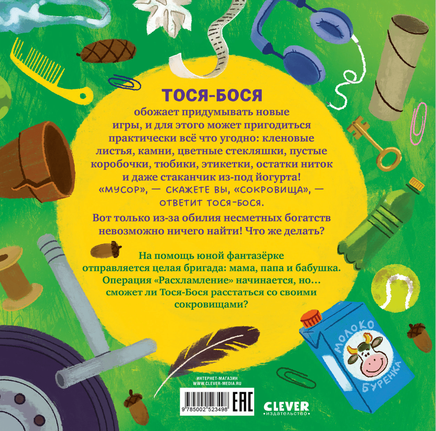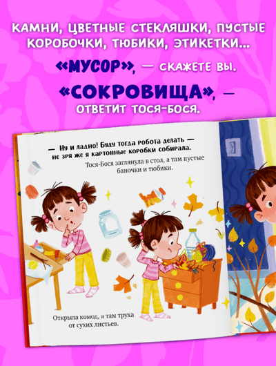 Тося-Бося обожает придумывать новые игры, и для этого может пригодиться практически всё: кленовые листья, коробочки, тюбики, этикетки, остатки ниток. «Мусор», — скажете вы. «Сокровища», — ответит Тося-Бося. Вот только из-за обилия несметных богатств невозможно ничего найти! Что же делать? Сможет ли Тося-Бося расстаться со своими сокровищами?