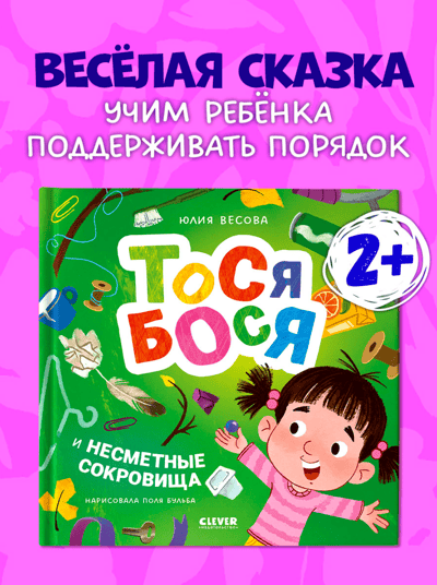 Издательство Clever представляет веселую книжку-картинку «Тося-Бося и несметные сокровища» популярного автора Юлии Весовой — захватывающий сюжет, понятная детям героиня книги для малышей, смешные сюжетные иллюстрации Clever книги и важная тема для обсуждения с ребенком. А еще на форзацах книжки для детей 3 лет вы найдете развивающие задания для девочек и мальчиков.