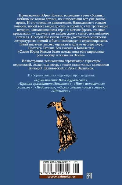 Однажды Вася Куролесов — обычный молодой человек из подмосковной деревни Сычи — решил купить поросят в районном центре. Вот только он и подумать не мог, что из этого выйдет целая детективная история со стрельбой, маскировкой и слежкой за коварными преступниками. Главному герою повести «Недопёсок», маленькому, но отважному песцу с императорским именем Наполеон Третий, тоже не сиделось на месте. В один прекрасный день Наполеон сбежал из тёплой клетки и отправился на север. И наверняка добрался бы до самого полюса, не окажись он случайно в деревне Ковылкино, где его ждало множество приключений в компании новых друзей. И это лишь часть увлекательных произведений Юрия Коваля, вошедших в настоящий сборник. Написанные с тонким юмором, порой веселящие до слёз, а порой до слёз трогающие истории, запоминающиеся персонажи и меткие фразы, уже ставшие крылатыми, — заскучать не получится даже у искушённого читателя.