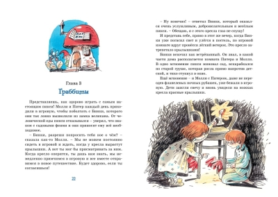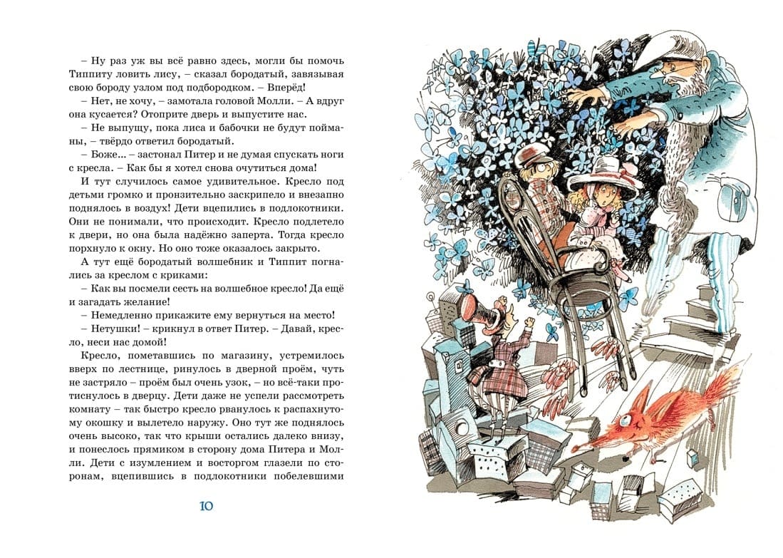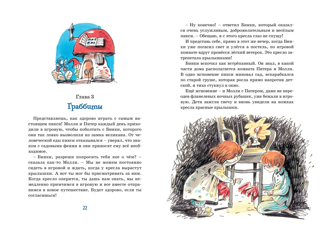 У Молли и Питера – главных героев книги – появилась тайна, самая удивительная и чудесная тайна на свете! В их игровой комнате стоит волшебное кресло, которое в любой момент может отрастить крылышки и перенести своих юных хозяев, куда только они пожелают! Дети посетят замок великана и Исчезающий остров, побывают в гостях у волшебника Хо-Хо и у колдуньи Сниппит… Много-много всего интересного и удивительного ждёт их! А путешествовать Молли и Питер будут вместе со своим замечательным другом – смешным и добрым пикси по имени Бинки.