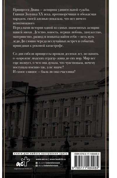 Принцесса Диана – женщина удивительной судьбы. Главная Золушка XX века, противоречивая и обожаемая народом, своей жизнью показала, что нет ничего невозможного. Перед вами история одной из самых знаменитых женщин нашей эпохи. Детство, юность, первая любовь, замужество, материнство, развод и попытка найти себя – весь путь леди Ди словно череда неслучайных встреч и событий, приведшая к роковой катастрофе. Со дня гибели принцессы прошли десятки лет, но память о «королеве людских сердец» жива до сих пор. Мир все еще волнует, о чем она думала, что чувствовала, почему поступала именно так, а не иначе? И самое главное - была ли она счастлива?