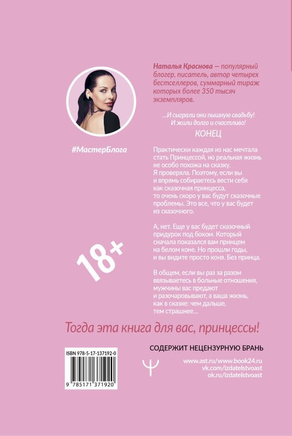 И сыграли они пышную свадьбу! И жили долго и счастливо! Конец. Этим словом заканчиваются все сказки. Но мы‑то с вами знаем, что после слова «конец» начинается самое интересное... Реальная жизнь — далеко не сказка, но многие женщины, когда‑то в детстве примерив на себя образ Принцессы, продолжают в нем жить, задаваясь вопросами: почему из плана жить «долго и счастливо» получается только «долго» и почему очередной Иван‑Царевич оказался очередным Иваном‑Дураком? Портреты 18 Принцесс — это 18 моделей поведения, 18 сценариев, по которым живет большинство женщин и которые мешают строить здоровые гармоничные отношения. Если вы собираетесь вести себя как сказочная принцесса, то очень скоро у вас будут сказочные проблемы. Это все, что у вас будет из сказочного. Конец. (Да‑да, сейчас начнется самое интересное, читайте книгу.)