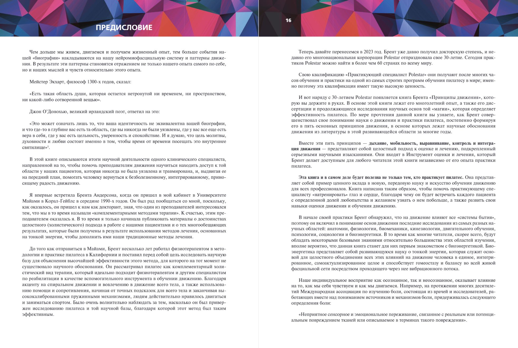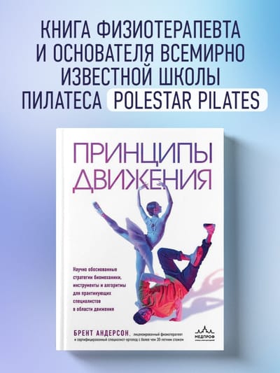 Книга «Принципы движения», написанная основателем методики Polestar Pilates Брентом Андерсеном, представляет собой практическое руководство по биомеханике для специалистов, практикующих пилатес, мануальных и двигательных терапевтов и спортивных врачей. А также для всех тех, кто ищет практичный и простой способ улучшить свои двигательные навыки на сцене и в жизни. Программа, описанная в книге, применяется в физиотерапии, трудотерапии, в процессе спортивных тренировок, кинезиологии, физическом воспитании, пилатесе, йоге, танцах и т.д. Она предназначена для того, чтобы помочь практикующим специалистам повысить качество своей работы за счет лучшего понимания интегрированной модели оценки движений и облегчения боли в теле путем формирования неправильных паттернов движения.
