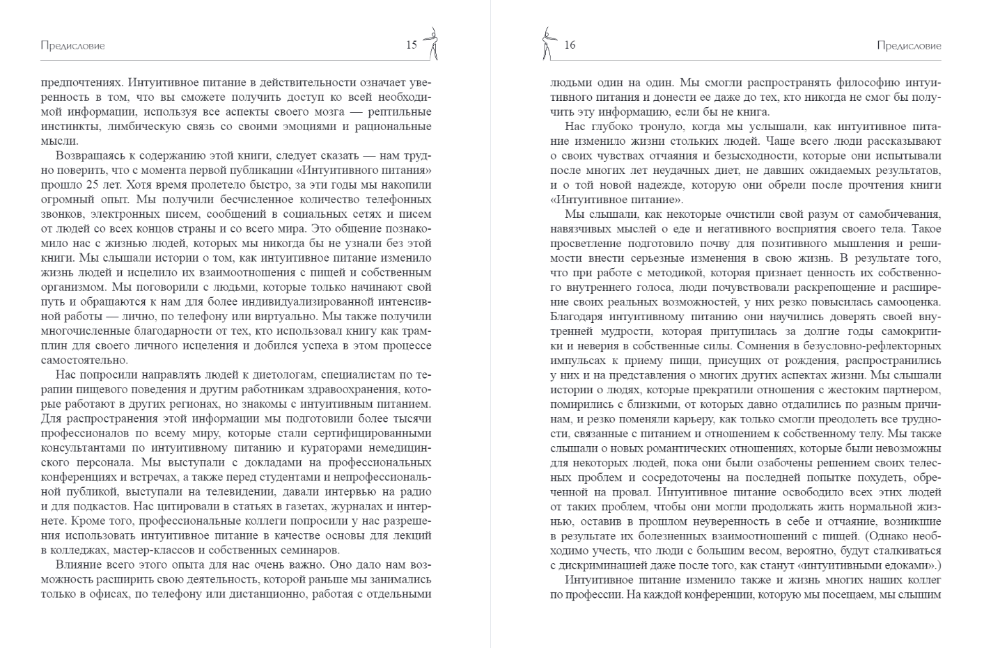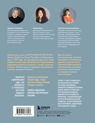 Эмоциональный голод — это невозможность быть собой и, как следствие, попытка заглушить свою грусть и стресс вкусной едой. Но еда не поможет устранить боль, гнев, печаль. А такие привычки ведут к развитию расстройств пищевого поведения. Многие из вас испытывали страх перед обедом в общественном месте или стыд за ночной ужин втайне от близких? Авторы, выдающиеся специалисты в области питания и расстройств пищевого поведения, призывают читателей начать позитивно относится к своему телу и выработать новое отношение к своим эмоциям — забыть все, чему их учили о подсчете калорий и других аспектах диеты, культуры и узнать о вреде стигмы веса. Интуитивное питание — не что иное, как разумный и рациональный подход к еде. Новое издание выпущено под редакцией Светланы Бронниковой, самого авторитетного российского специалиста в области питания и психологии.