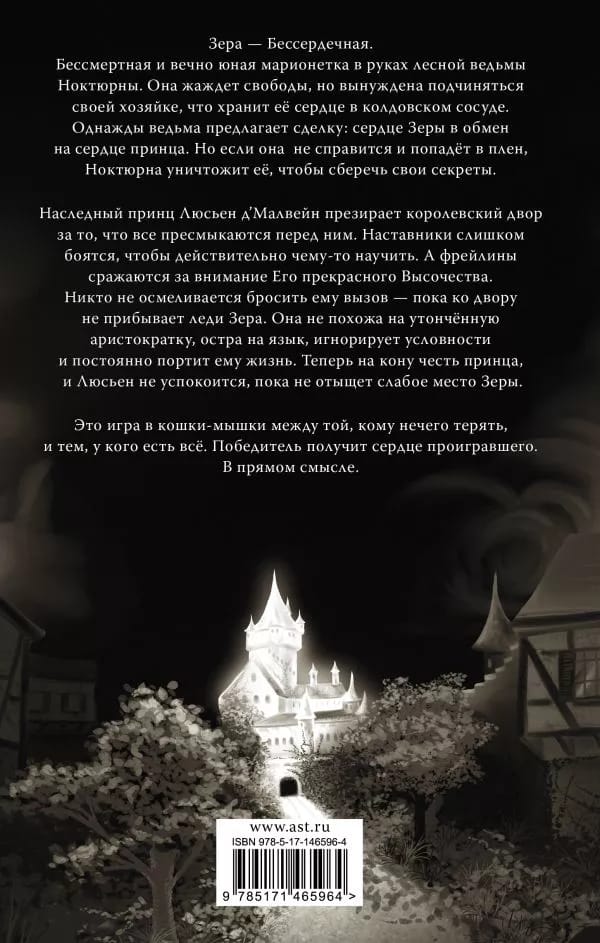 Зера — Бессердечная. Бессмертная и вечно юная марионетка в руках лесной ведьмы Ноктюрны. Она жаждет свободы, но вынуждена подчиняться своей хозяйке, что хранит её сердце в колдовском сосуде. Однажды ведьма предлагает сделку: сердце Зеры в обмен на сердце принца. Но если она не справится и попадёт в плен, Ноктюрна уничтожит её, чтобы сберечь свои секреты. Наследный принц Люсьен д’Малвейн презирает королевский двор за то, что все пресмыкаются перед ним. Наставники слишком боятся, чтобы действительно чему-то научить. А фрейлины сражаются за внимание Его прекрасного Высочества. Никто не осмеливается бросить ему вызов — пока ко двору не прибывает леди Зера. Она не похожа на утончённую аристократку, остра на язык, игнорирует условности и постоянно портит ему жизнь. Теперь на кону честь принца, и Люсьен не успокоится, пока не отыщет слабое место Зеры. Это игра в кошки-мышки между той, кому нечего терять, и тем, у кого есть всё. Победитель получит сердце проигравшего. В прямом смысле.