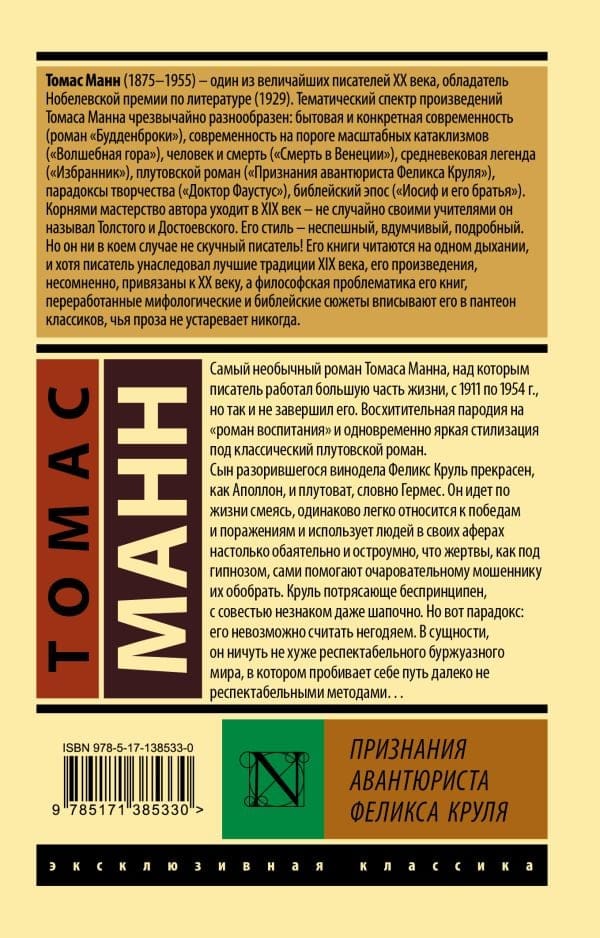 Самый необычный роман Томаса Манна, над которым писатель работал большую часть жизни, с 1911 по 1954 г., но так и не завершил его. Восхитительная пародия на «роман воспитания» и одновременно яркая стилизация под классический плутовской роман. Сын разорившегося винодела Феликс Круль прекрасен, как Аполлон, и плутоват, словно Гермес. Он идет по жизни смеясь, одинаково легко относится к победам и поражениям и использует людей в своих аферах настолько обаятельно и остроумно, что жертвы, как под гипнозом, сами помогают очаровательному мошеннику их обобрать. Круль потрясающе беспринципен, с совестью незнаком даже шапочно. Но вот парадокс: его невозможно считать негодяем. В сущности, он ничуть не хуже респектабельного буржуазного мира, в котором пробивает себе путь далеко не респектабельными методами…