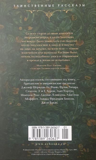 Серия «Таинственные рассказы» — это сборники произведений малой прозы, написанных в XIX — первой половине ХХ века. Истории, вводящие читателей в мир, где обыденное соседствует со сверхъестественным, где судьбы героев вершат вселяющие страх потусторонние силы, а сама граница между жизнью и смертью оказывается зыбкой, издавна пользовались популярностью. Овеянные мрачным колоритом, драматичные сюжеты о родовых проклятиях, загадках старинных портретов, сделках с дьяволом, неприкаянных душах, призраках и т. д. стали особенно популярны в эпоху романтизма. Но и позднее интерес читателей к ним не иссяк: даже в эпоху философского скептицизма, расцвета науки и триумфа техники готическая литература остается востребованной, а таинственное, необъяснимое, чудесное по-прежнему и привлекает, и завораживает. Авторы рассказов, составивших эту книгу, — британские и американские писатели: Джозеф Шеридан Ле Фаню, Фрэнк Ричард Стоктон, Э. и Х. Херон, Эдит Уортон, Монтегю Родс Джеймс, Кливленд Лэнгстон Моффетт, Эдвард Фредерик Бенсон, Джон Бакан.