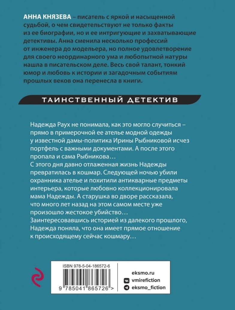 Надежда Раух не понимала, как это могло случиться — прямо в примерочной ее ателье модной одежды у известной дамы-политика Ирины Рыбниковой исчез портфель с важными документами. А после этого пропала и сама Рыбникова… С этого дня давно отлаженная жизнь Надежды превратилась в кошмар. Следующей ночью убили охранника ателье и похитили антикварные предметы интерьера, которые любовно коллекционировала мама Надежды. А старушка во дворе рассказала, что много лет назад на этом самом месте уже произошло жестокое убийство… Заинтересовавшись историей из далекого прошлого, Надежда поняла, что она имеет прямое отношение к происходящему сейчас кошмару…