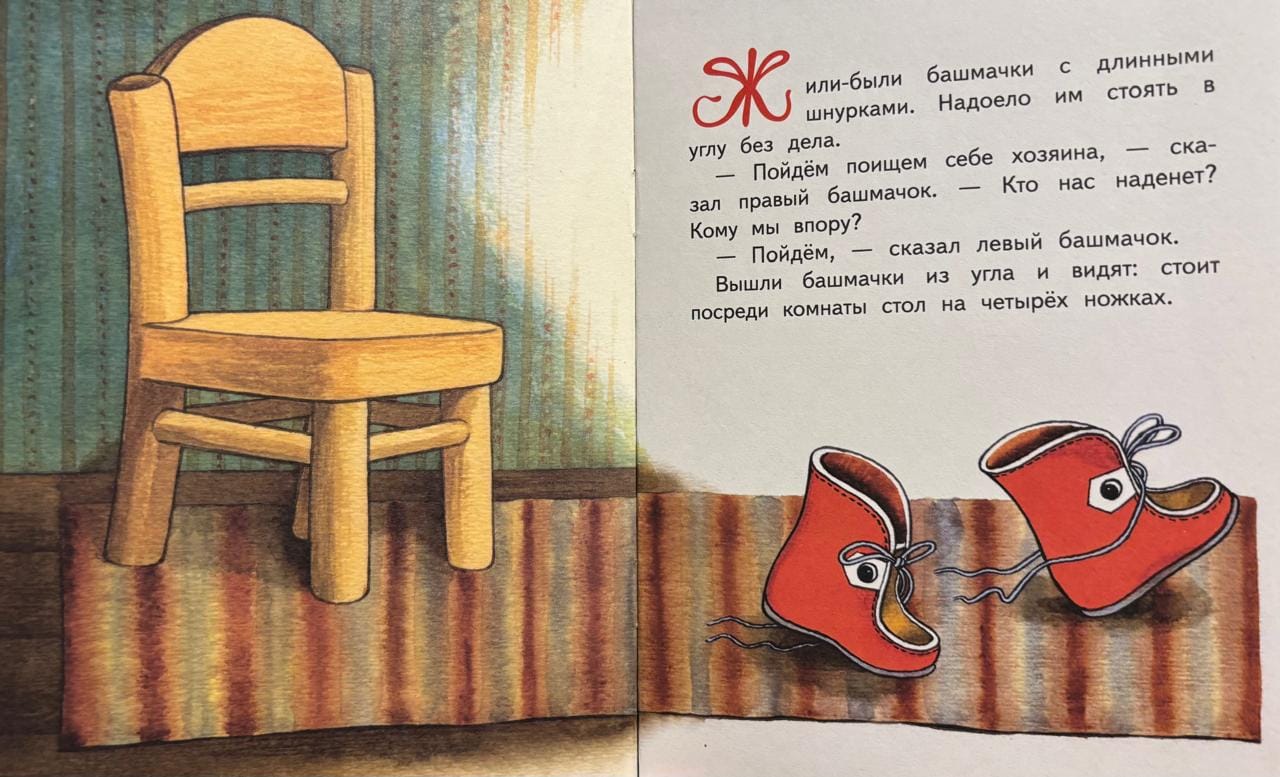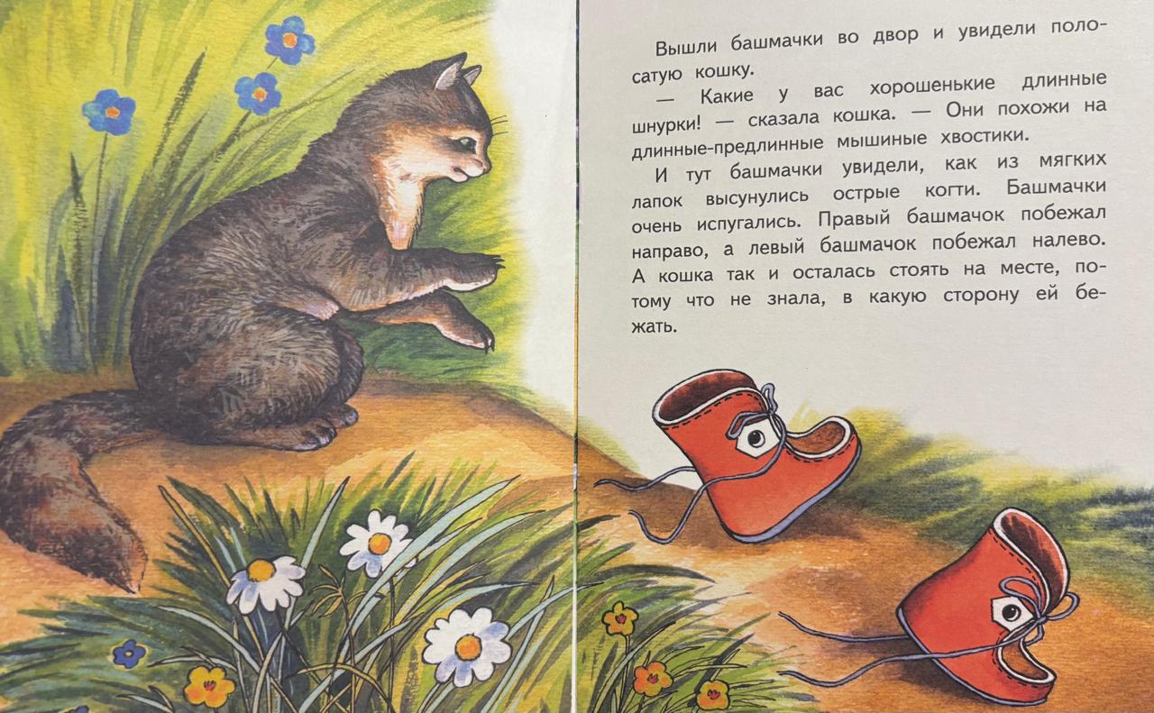 Жили-были два башмачка: левый и правый. Пошли они искать для себя подходящие ножки, чтобы вместе с ними бегать и прыгать. По дороге им встретились стол, кошка, корова, уж, утка и воробей. Стол признался, что не умеет бегать, кошка погналась за шнурками, приняв их за мышиные хвостики, корова сказала, что ей нужны четыре башмачка, у ужа просто не было ножек, утке башмачки мешали плавать, а воробью – летать. Но башмачки не отчаивались, и нашли для себя подходящие ножки. Вы уже догадались, кого они встретили потом?