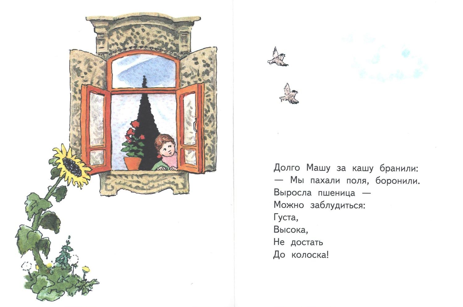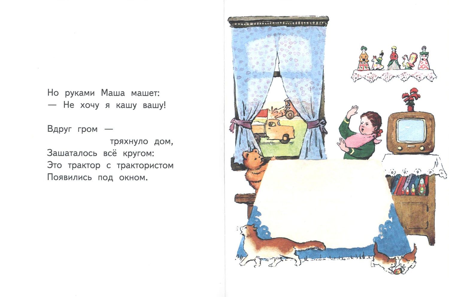 Дымится на столе каша — вкусная, сладкая, с душистым молоком! Вот только не хочет Маша её есть, капризничает! Обиделись на девочку речка, печка и Бурёнка, сердиты тракторист, комбайнёр и шофёр! Как же тут поступить?