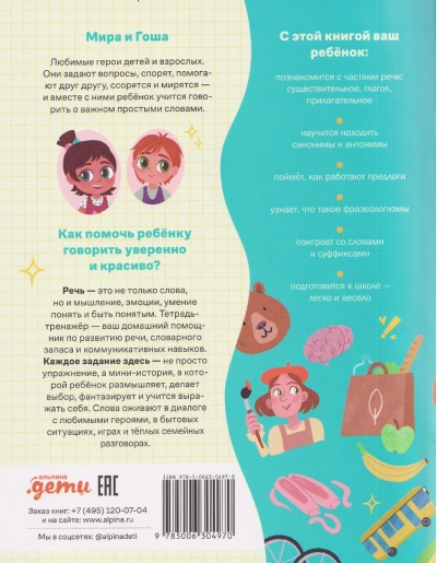 «Мира и Гоша. Вместе узнаём новые слова» — тетрадь-тренажёр, где каждое задание превращается в маленькое приключение с любимыми героями Мирой и Гошей. Вместо зубрёжки — мини-истории, загадки, игровые задания и бытовые диалоги. Вместо однообразных упражнений — вопросы, которые заставляют подумать, посмеяться или даже поспорить. Ребёнок не только расширяет словарный запас, но и учится правильно называть предметы, действия, явления, подбирать слова по смыслу и строить собственные фразы.
