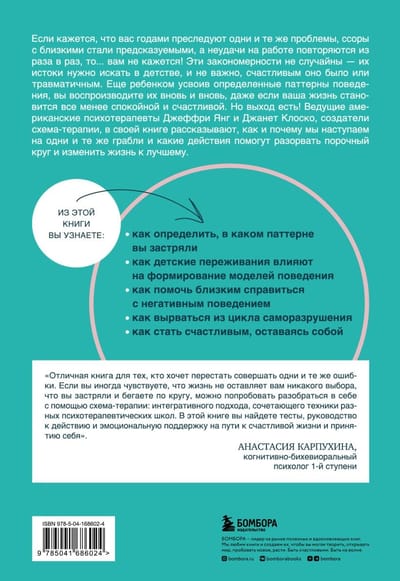 Если кажется, что вас годами преследуют одни и те же проблемы, ссоры с близкими стали предсказуемыми, а неудачи на работе повторяются из раза в раз, то... вам не кажется! Эти закономерности не случайны — их истоки нужно искать в детстве, и не важно, счастливым оно было или травматичным. Еще ребенком усвоив определенные паттерны поведения, вы воспроизводите их вновь и вновь, даже если ваша жизнь становится все менее спокойной и счастливой. Но выход есть! Ведущие американские психотерапевты Джеффри Янг и Джанет Клоско, создатели схематерапии, в своей книге рассказывают, как и почему мы наступаем на одни и те же грабли и какие действия помогут разорвать порочный круг и изменить жизнь к лучшему.