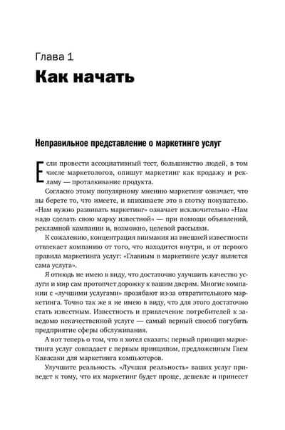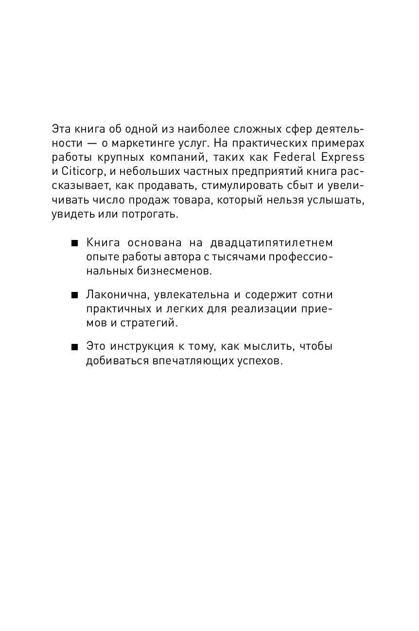 Маркетинг услуг — одна из наиболее сложных сфер профессиональной деятельности. Вы не можете дотронуться до основного продукта своей компании, услышать его или увидеть. Тогда как же организовывать продажи и стимулировать сбыт? Книга Гарри Беквита, основанная на двадцатипятилетнем опыте работы автора с тысячами профессиональных бизнесменов, доносит до читателей маркетинговые знания через рассмотрение практических примеров работы крупных компаний, таких как Federal Express и Citicorp, и небольших частных предприятий. Книга лаконична, увлекательна и содержит сотни практичных и легких для реализации приемов и стратегий, которые используются в сфере маркетинга услуг. Издание ориентировано на специалистов в области маркетинга услуг, а также студентов и преподавателей экономических вузов.
