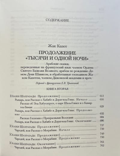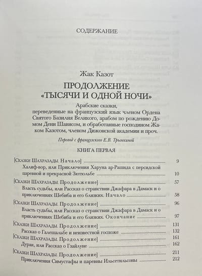 С появлением на европейских языках новых переводов различных версий «Тысячи и одной ночи» о сочинении Казота постепенно забыли. Настоящее издание призвано восполнить эту лакуну. В данном сборнике воспроизведены замечательные иллюстрации Клеман-Пьера Марилье (1740—1808), созданные им к сказкам Казота в рамках цикла иллюстраций к знаменитому французскому многотомному своду «Кабинет фей» (1785—1789). Помимо сказок Казота, в книге публикуется очерк о нём Жерара де Нерваля (1808—1855), сопровождённый классическими гравюрами Эдуарда де Бомона (1821—1888).