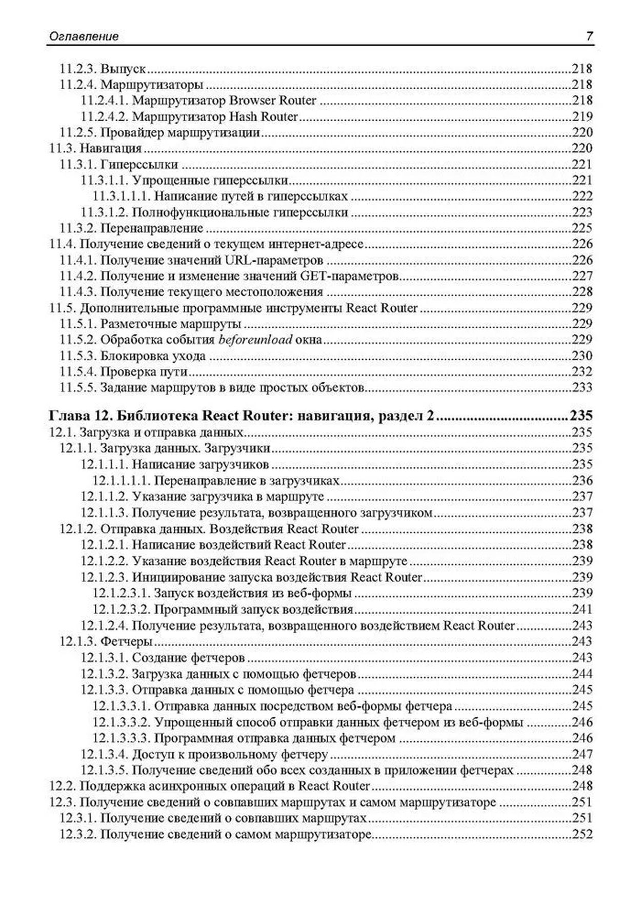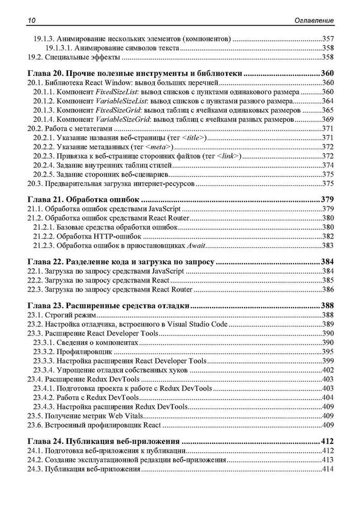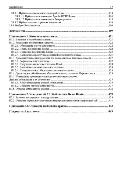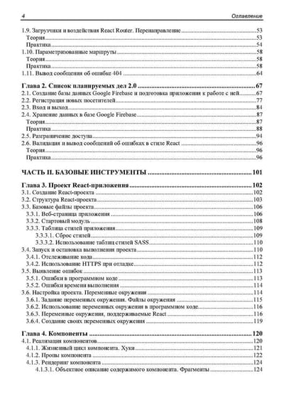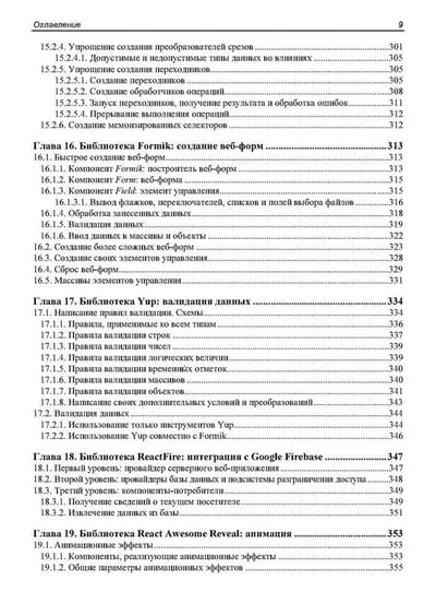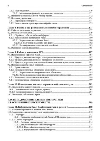 Книга посвящена программированию веб-приложений на языке JavaScript с применением популярного веб-фреймворка React. Дается вводный курс, наглядно, по шагам описывающий разработку несложного веб-приложения — списка запланированных дел. Описываются базовые инструменты: создание и настройка React-проекта, написание компонентов, язык JSX, передача данных между компонентами и создание веб-форм. Рассматриваются полезные дополнительные библиотеки: React Router (навигация), Redux, React Redux и Redux Toolkit (централизованное хранилище данных), Formik (быстрая разработка веб-форм), Yup (валидация), React Reveal (анимационные эффекты) и др. Рассказывается о разделении кода, обработке ошибок, средствах отладки, публикации готового веб-приложения и рендеринге на стороне сервера.