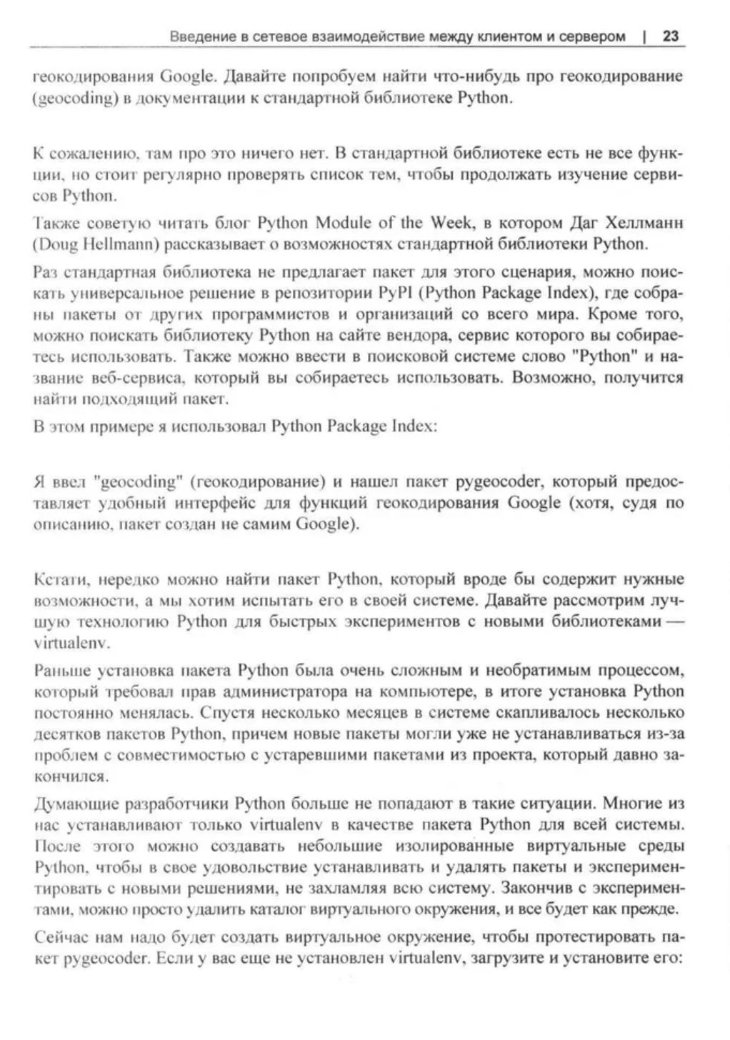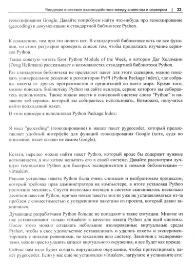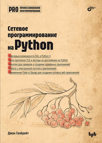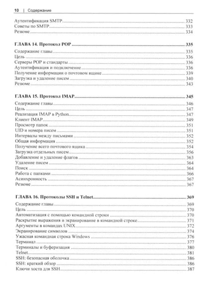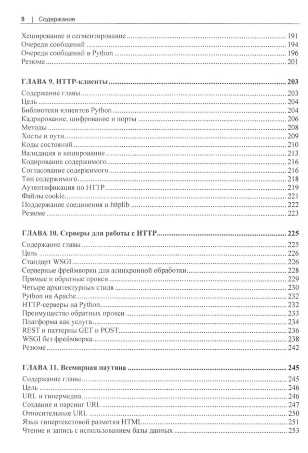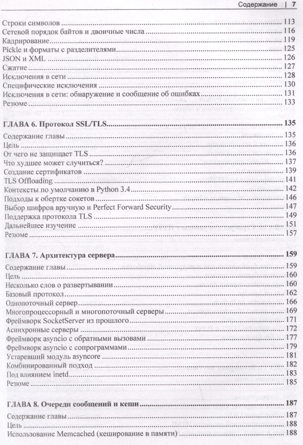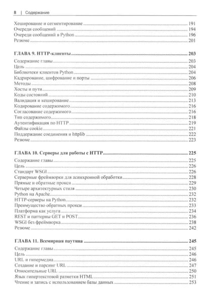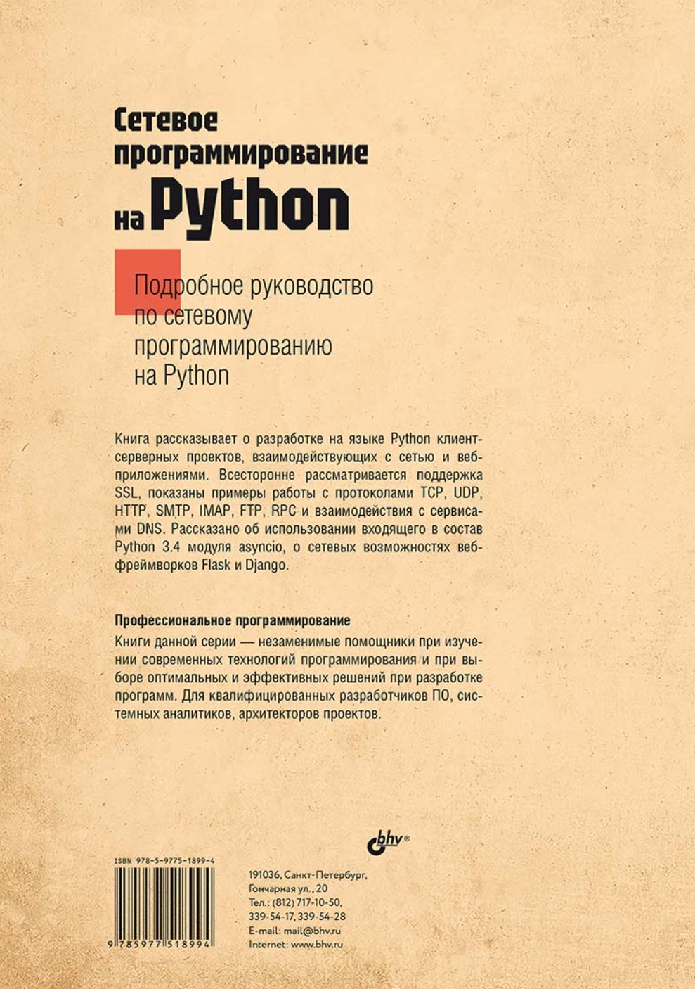 Книга посвящена разработке серверных приложений и клиент-серверных архитектур на Python. Рассказано о поддержке SSL в Python 3, представлены примеры работы с протоколами TCP, UDP, HTTP, SMTP, IMAP, FTP, RPC, взаимодействия с сервисами DNS. Освещена работа с электронной почтой в приложениях. Описаны цели протокола TLS и методы их достижения на Python. Подробно описаны возможности модуля asyncio, входящего в состав Python 3.4, даны рекомендации по разработке сетевых приложений с использованием веб-фреймворков Flask и Django.