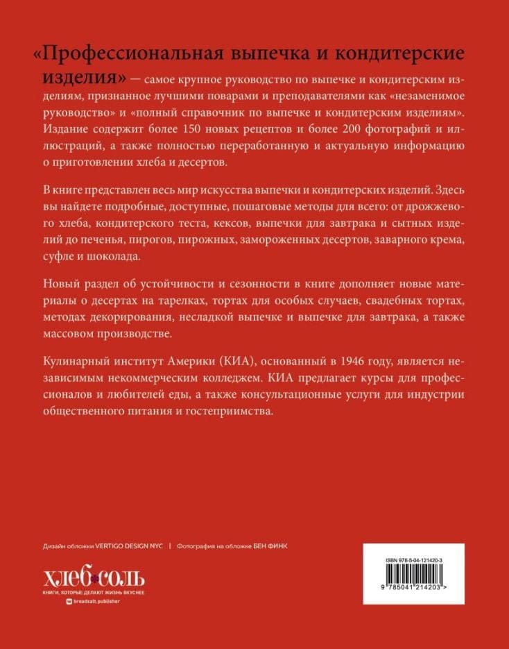 Представляем вашему вниманию уникальное издание для профессионалов в области выпечки и кондитерского дела и для тех, кто только вступает на этот путь. «Профессиональные выпечка и кондитерские изделия» — это актуальное собрание более 150 рецептов выпечки и кондитерских изделий; переработанная и обновленная информация о техниках приготовления хлеба, десертов, тортов, шоколада и не только; современные тенденции в оформлении. Книга станет отличным подарком себе, знакомому шеф-кондитеру или пекарю, который несомненно оценит подобный продуманный и содержательный подарок.