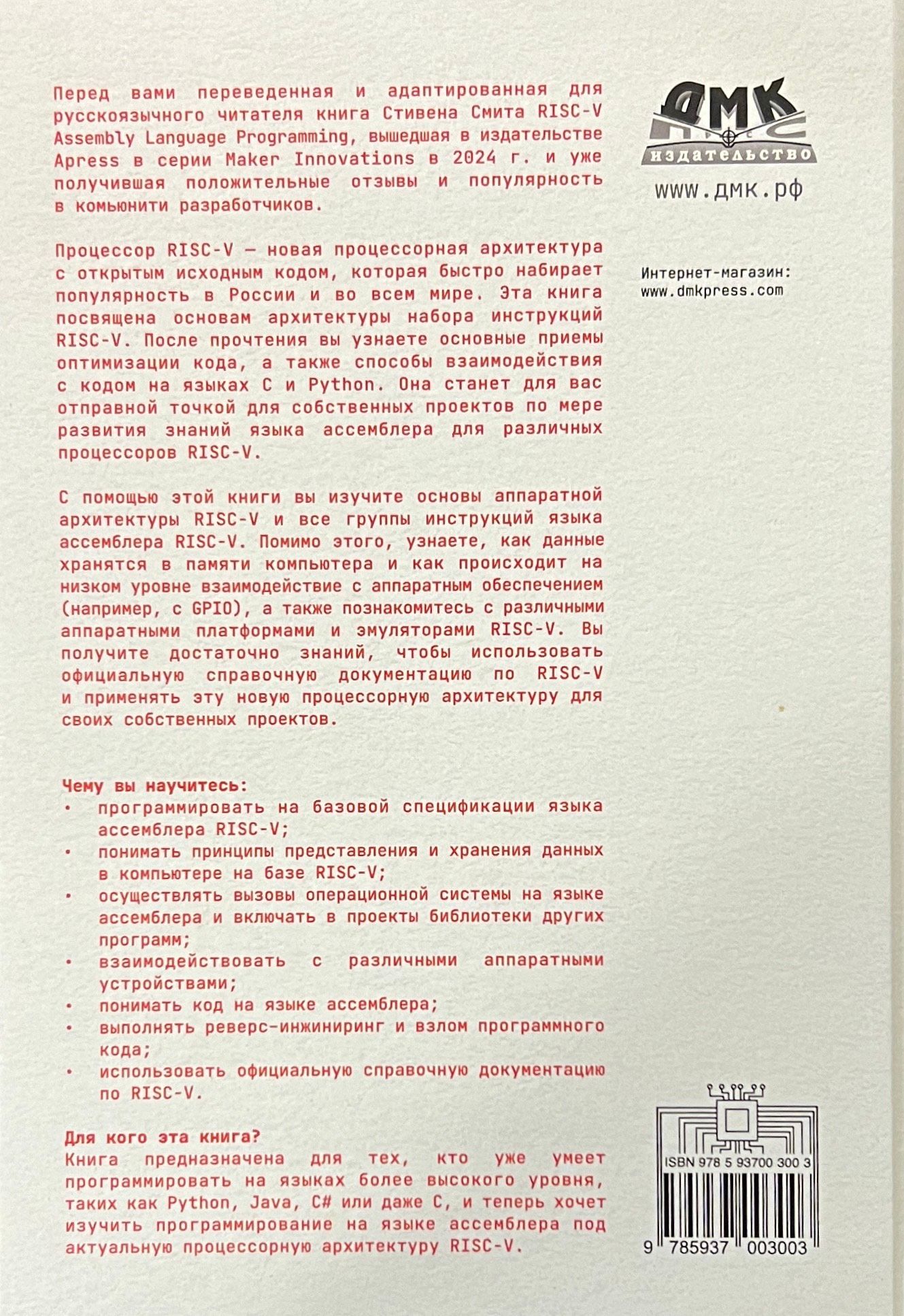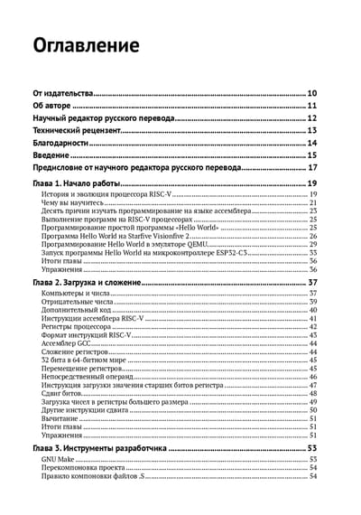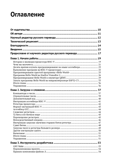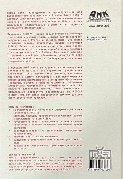 Книга предназначена для программистов, инженеров и студентов, которые уже умеют программировать на языках высокого уровня, таких как Python, Java, C# или даже C, и хотят изучить программирование на языке ассемблера на основе новой процессорной архитектуры RISC-V.
