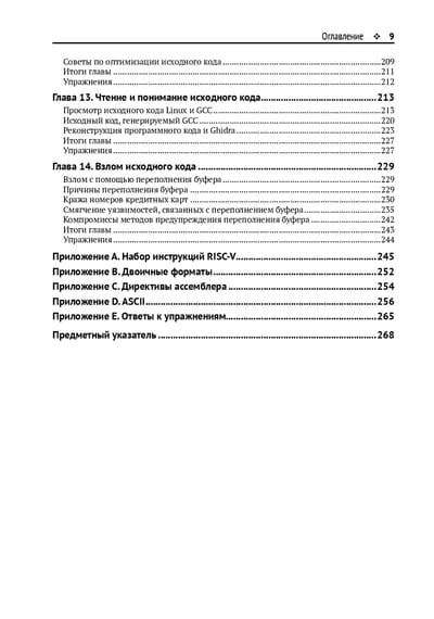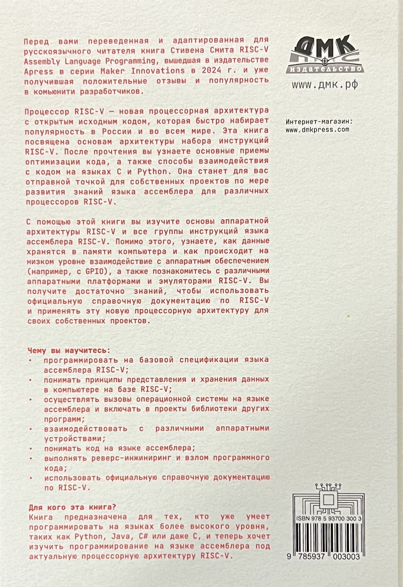 В ней изложены основы архитектуры набора инструкций RISC-V, описаны все группы инструкций языка ассемблера RISC-V, даны основные приемы разработки/оптимизации кода, а также способы взаимодействия с кодом на языках C и Python. Изучив основы программирования на языке ассемблера RISC-V с помощью этой книги, вы получите достаточно знаний, чтобы на ее основе создавать собственные проекты.