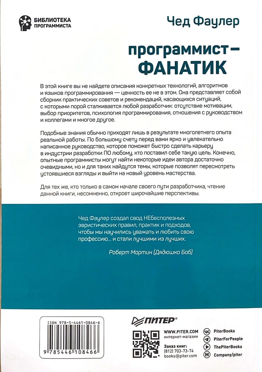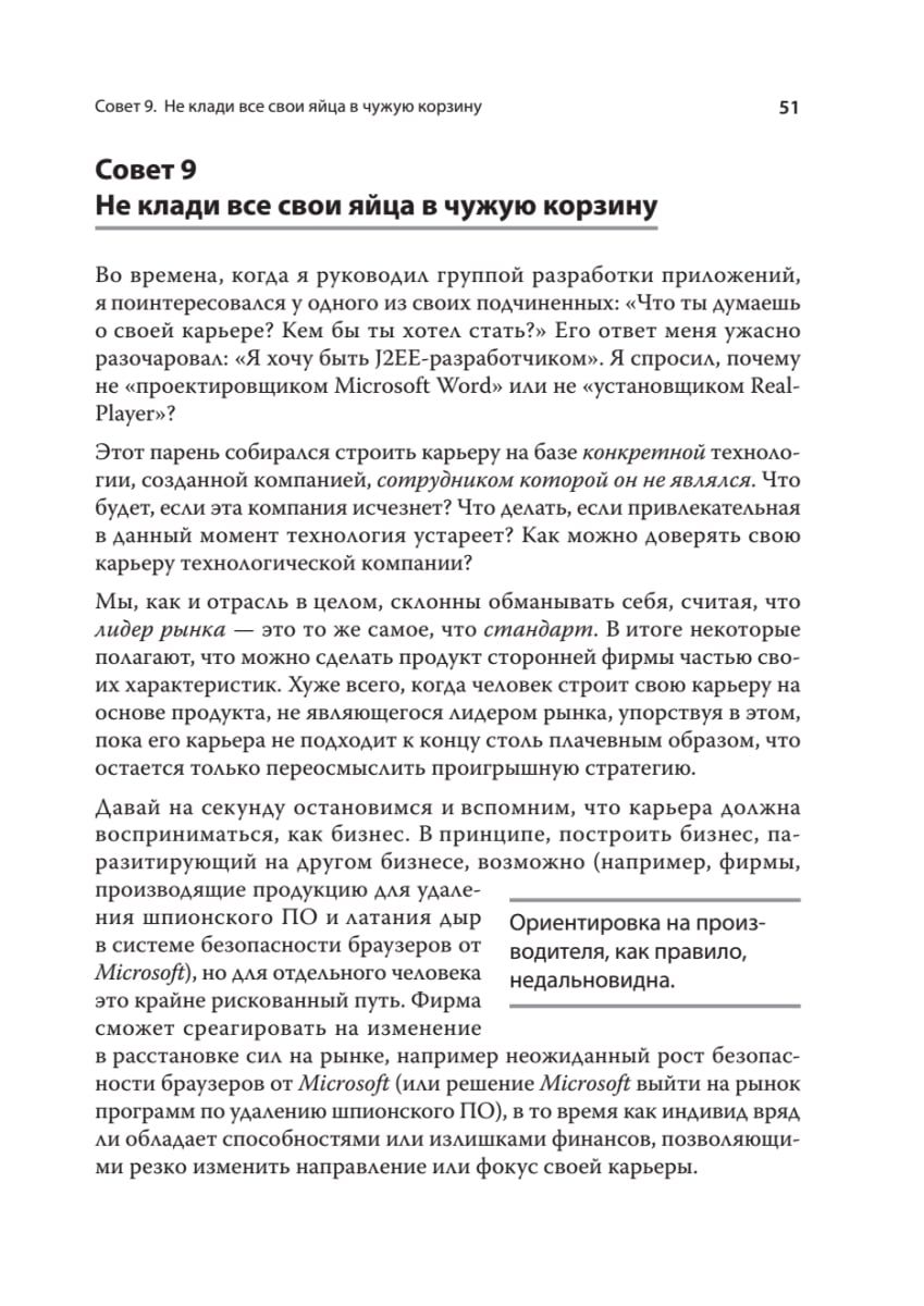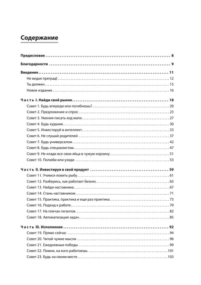 В этой книге вы не найдете описания конкретных технологий, алгоритмов и языков программирования – ценность ее не в этом. Она представляет собой сборник практических советов и рекомендаций, касающихся ситуаций, с которыми порой сталкивается любой разработчик: отсутствие мотивации, выбор приоритетов, психология программирования, отношения с руководством и коллегами и многих других. Подобные знания обычно приходят лишь в результате многолетнего опыта реальной работы. По большому счёту перед вами – ярко и увлекательно написанное руководство, которое поможет быстро сделать карьеру в индустрии разработки ПО любому, кто поставил себе такую цель. Конечно, опытные программисты могут найти некоторые идеи автора достаточно очевидными, но и для таких найдутся темы, которые позволят пересмотреть устоявшиеся взгляды и выйти на новый уровень мастерства. Для тех же, кто только в самом начале своего пути как разработчика, чтение данной книги, несомненно, откроет широчайшие перспективы.