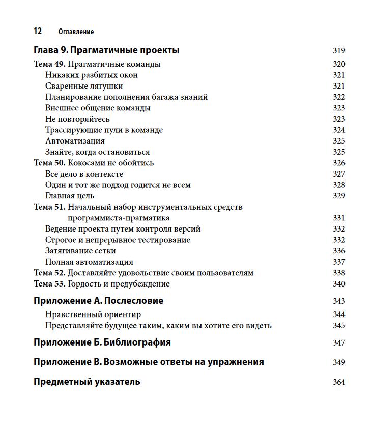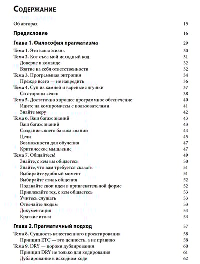 Из него читатель, будь он начинающим или опытным разработчиком программного обеспечения, сможет всегда почерпнуть свежие идеи. Дэвид Томас и Эндрю Хант написали первое издание этой замечательной книги в 1999 году, чтобы помочь своим клиентам в создании более качественного программного обеспечения и помочь открыть для себя удовольствие от программирования. Уроки, извлеченные из этой книги, помогли целому поколению программистов усвоить саму суть разработки программного обеспечения, независимо от конкретного языка, библиотеки или методики. Предложенный авторами книги прагматичный философский подход к разработке программного обеспечения нашел широкое распространение, породив сотни других книг и статей, а также послужил началом для тысяч успешных карьер и историй профессионального роста. Теперь, двадцать лет спустя, в новом издании авторы по-новому взглянули на то, что такое современный программист. В этом издании затрагиваются самые разные темы: от личной ответственности разработчика до развития его карьеры, архитектурные приемы, обеспечивающие гибкость исходного кода и возможность легкого его изменения. Эта книга написана в виде последовательного ряда автономных тем-разделов, сдобрена немалой долей классических и свежих анекдотов, тщательно продуманными примерами и интересными аналогиями, демонстрируя тем самым наилучшие подходы к разработке программного обеспечения и основные ловушки на этом пути. Начинающие или опытные программисты, как и руководители программных проектов, смогут извлечь немало уроков из этой книги в своей повседневной деятельности, быстро добившись улучшений в производительности труда, пунктуальности и удовлетворенности своей работой. Книга поможет читателю выработать и развить навыки и отношения, образующие прочный фундамент его успешной карьеры в долгосрочной перспективе. В конечном счете он станет программистом-прагматиком.