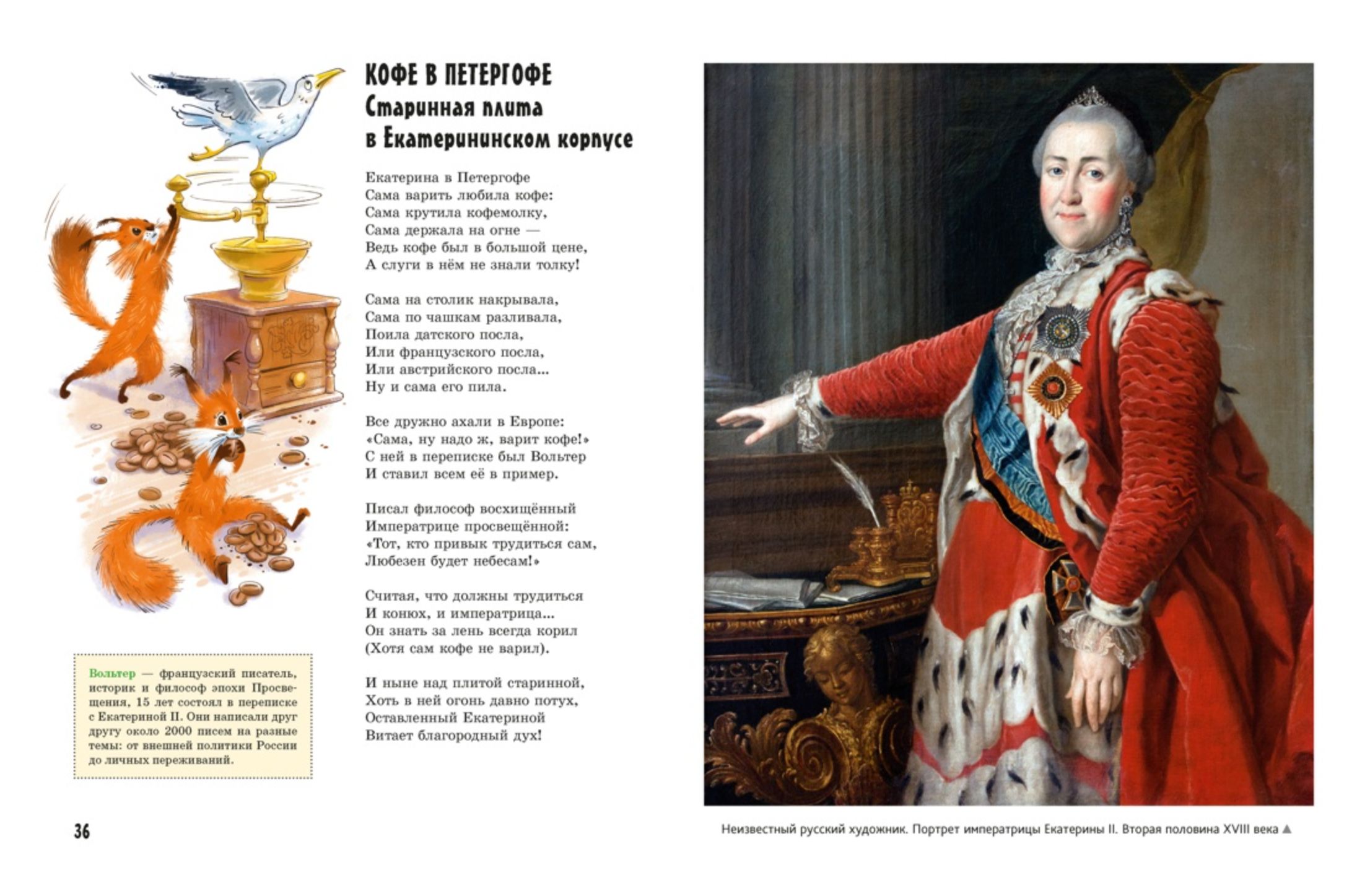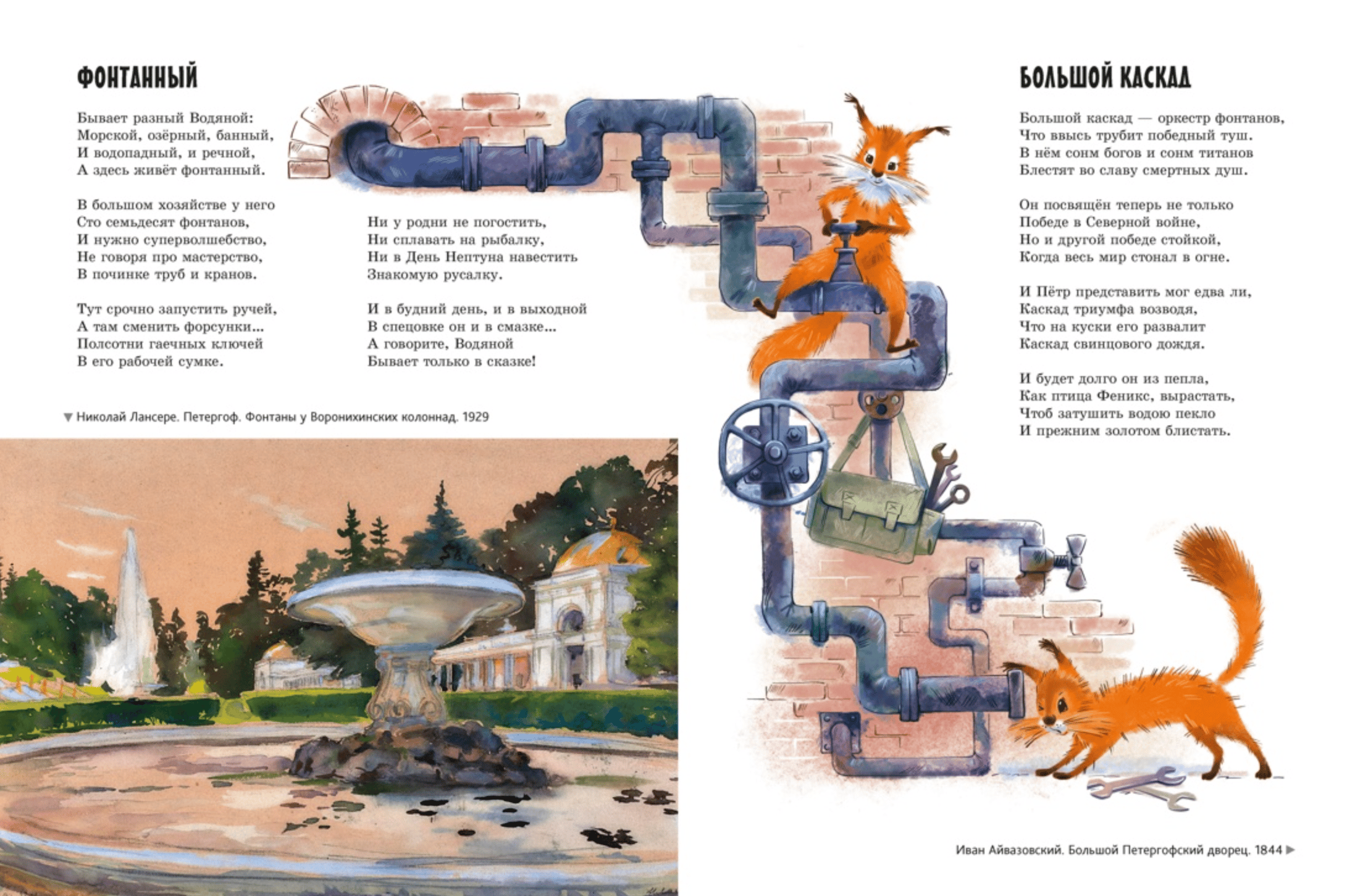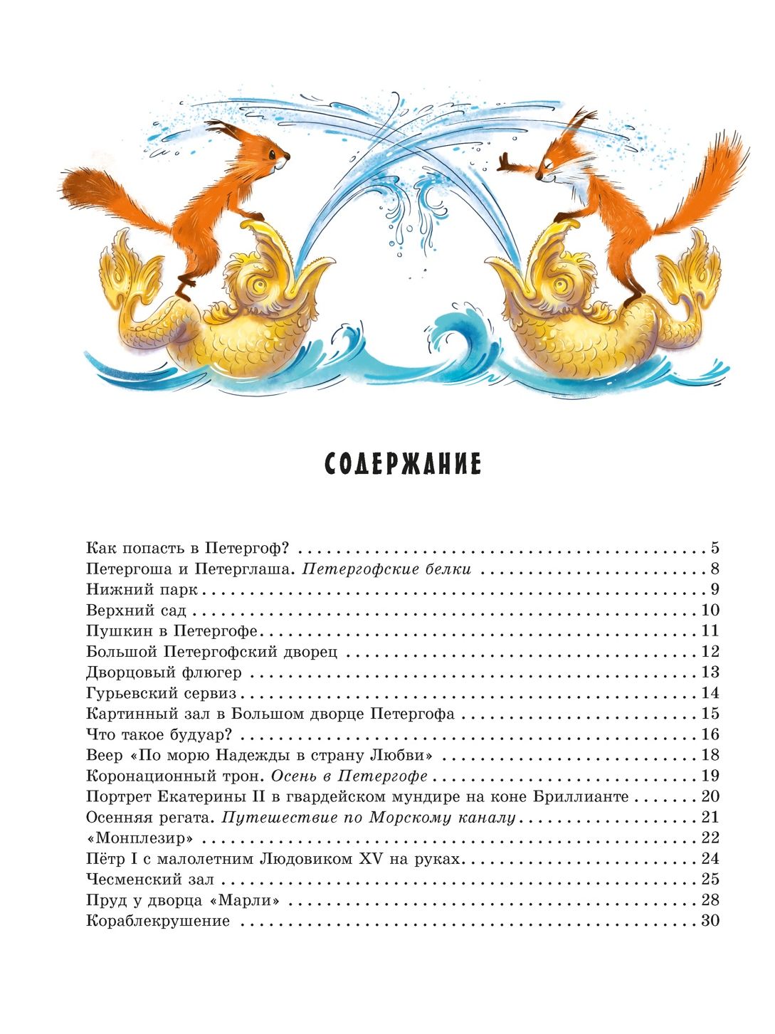 Ура, мы едем в Петергоф — знаменитую столицу дворцов и фонтанов! Скорее прыгайте в «Метеор» или «Ласточку»! Вы прогуляетесь по тенистым аллеям Верхнего сада и Нижнего парка, заглянете в будуар императрицы, узнаете, почему Екатерина II сама варила кофе, увидите картины значимых морских сражений Петровской эпохи, но это ещё не всё! Вы сможете покормить дрессированную рыбу в пруду у дворца «Марли», посидеть на самом настоящем царском троне и, конечно, искупаться в фонтанах-шутихах! А местные озорные белочки Петергоша и Петерглаша будут прыгать со страницы на страницу, приглашая вас заглянуть ещё и в Ораниенбаум и парк Александрия!