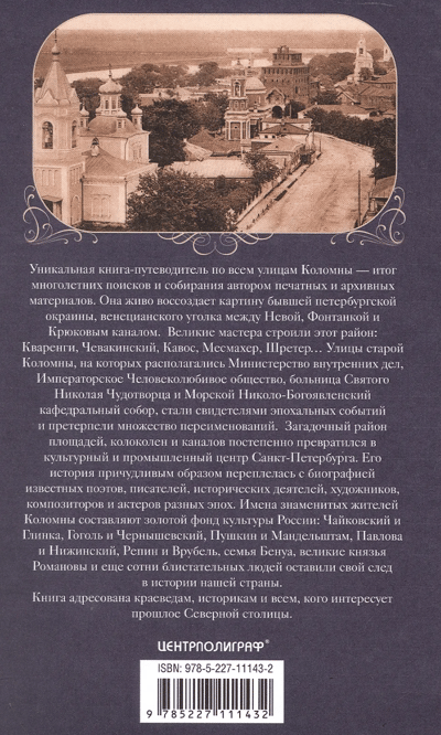 Эта уникальная книга-путеводитель по всем улицам Коломны — итог многолетних поисков и собирания автором печатных и архивных материалов. Она воссоздает живописную картину бывшей петербургской окраины, венецианского уголка между Невой, Фонтанкой и Крюковым каналом. Улицы старой Коломны, на которых располагались Министерство внутренних дел, Императорское Человеколюбивое общество, больница Святого Николая Чудотворца и Морской Николо-Богоявленский кафедральный собор, претерпели множество переименований и стали свидетелями многих перемен.