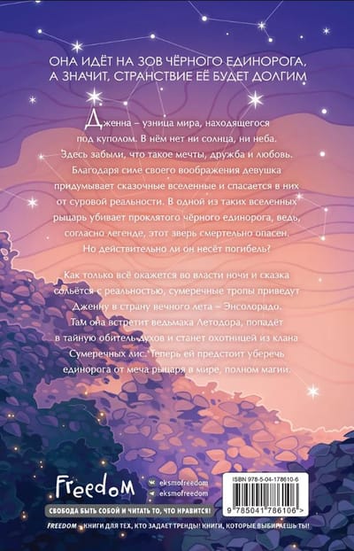 Как только все окажется во власти ночи и сказка сольется с реальностью, сумеречные тропы приведут Дженну в страну вечного лета — Энсолорадо. Там она встретит ведьмака Летодора, попадет в тайную обитель духов и станет охотницей из клана Сумеречных лис. Теперь ей предстоит уберечь единорога от меча рыцаря в мире, полном магии.