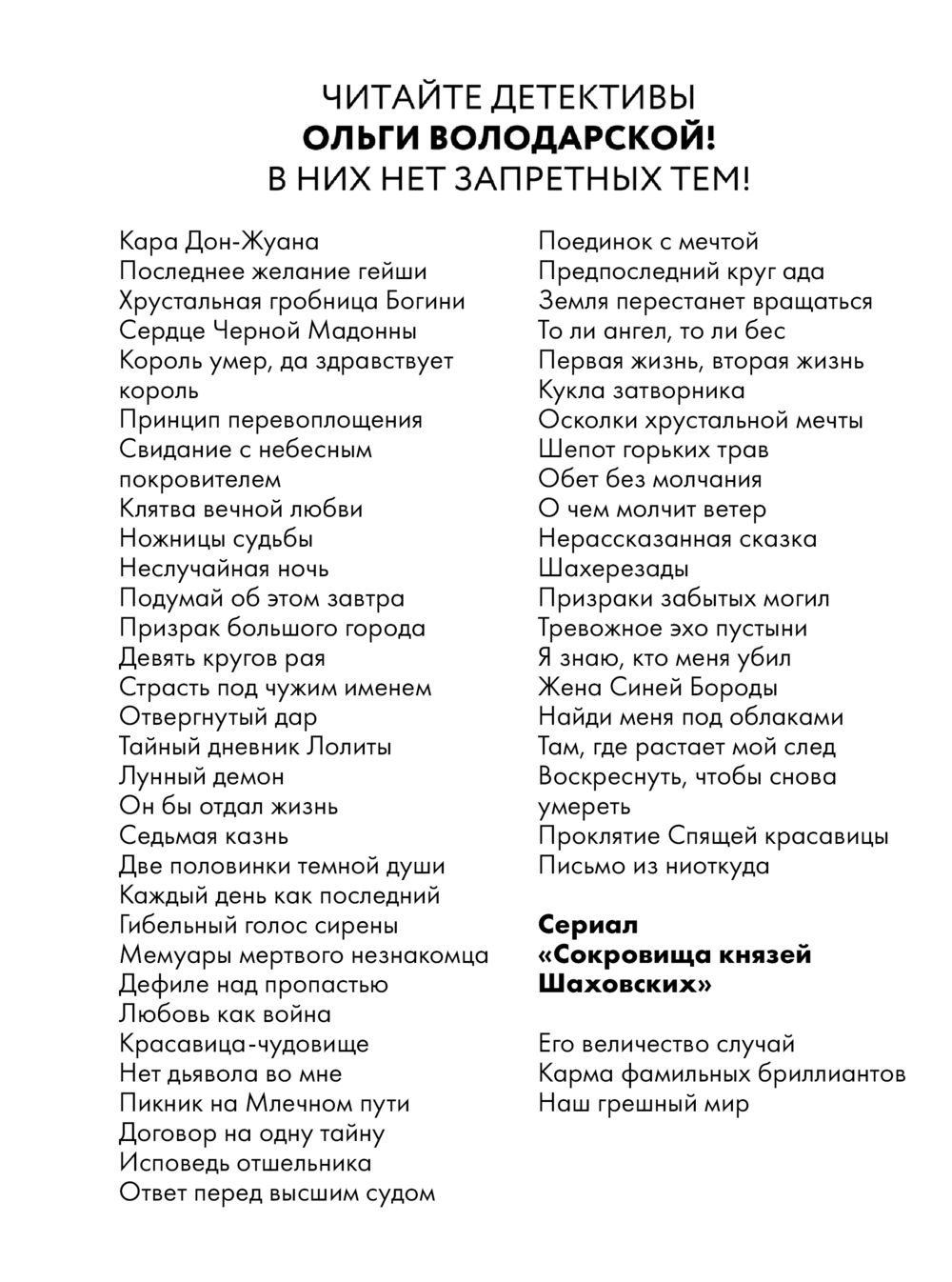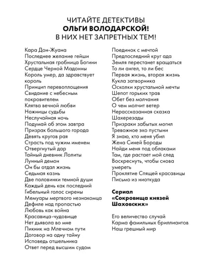 Романы Ольги Володарской — остросоциальные детективы, в которых автор препарирует все стороны жизни современного общества, ничего не скрывая и ни о чем не умалчивая. Ее книги написаны так увлекательно, что оторваться просто невозможно. Яркий сочный язык и блестящий авторский стиль создают неповторимую атмосферу, в которую с головой погружается читатель.