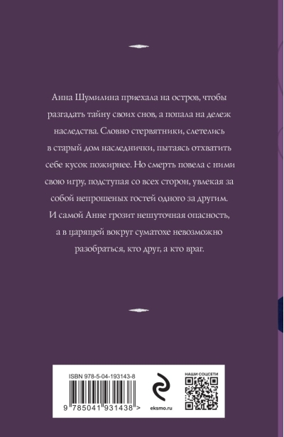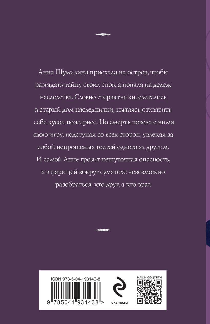 Анна Шумилина приехала на остров, чтобы разгадать тайну своих снов, а попала на дележ наследства. Словно стервятники, слетелись в старый дом наследнички, пытаясь отхватить себе кусок пожирнее. Но смерть повела с ними свою игру, подступая со всех сторон, увлекая за собой непрошеных гостей одного за другим. И самой Анне грозит нешуточная опасность, а в царящей вокруг суматохе невозможно разобраться, кто друг, а кто враг.