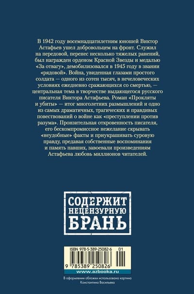 В 1942 году восемнадцатилетним юношей Виктор Астафьев ушел добровольцем на фронт. Служил на передовой, перенес несколько тяжелых ранений, был награжден орденом Красной Звезды и медалью «За отвагу», демобилизовался в 1945 году в звании «рядовой». Война, увиденная глазами простого солдата — одного из сотен тысяч, в нечеловеческих условиях ежедневно сражающихся со смертью, — центральная тема в творчестве выдающегося русского писателя Виктора Астафьева. Роман «Прокляты и убиты» — итог многолетних размышлений и одно из самых драматичных, трагических и правдивых повествований о войне как «преступлении против разума». Пронзительная откровенность писателя, его бескомпромиссное нежелание скрывать «неудобные» факты и приукрашивать суровую правду, предавая собственные воспоминания и память павших, завоевали произведениям Астафьева любовь миллионов читателей.