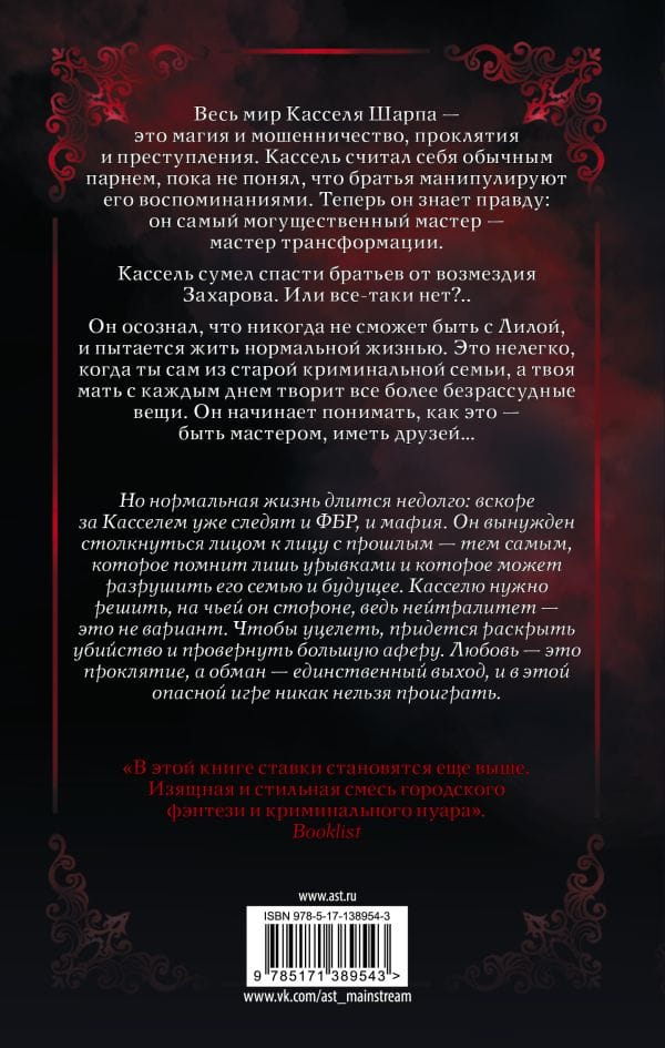 Весь мир Касселя Шарпа — это магия и мошенничество, проклятия и преступления. Кассель считал себя обычным парнем, пока не понял, что братья манипулируют его воспоминаниями. Теперь он знает правду: он самый могущественный мастер — мастер трансформации. Кассель сумел спасти братьев от возмездия Захарова. Или все таки нет?.. Он осознал, что никогда не сможет быть с Лилой, и пытается жить нормальной жизнью. Это нелегко, когда ты сам из старой криминальной семьи, а твоя мать с каждым днем творит все более безрассудные вещи. Он начинает понимать, как это — быть мастером, иметь друзей... Но нормальная жизнь длится недолго: вскоре за Касселем уже следят и ФБР, и мафия. Он вынужден столкнуться лицом к лицу с прошлым — тем самым, которое помнит лишь урывками и которое может разрушить его семью и будущее. Касселю нужно решить, на чьей он стороне, ведь нейтралитет — это не вариант. Чтобы уцелеть, придется раскрыть убийство и провернуть большую аферу. Любовь — это проклятие, а обман — единственный выход, и в этой опасной игре никак нельзя проиграть.