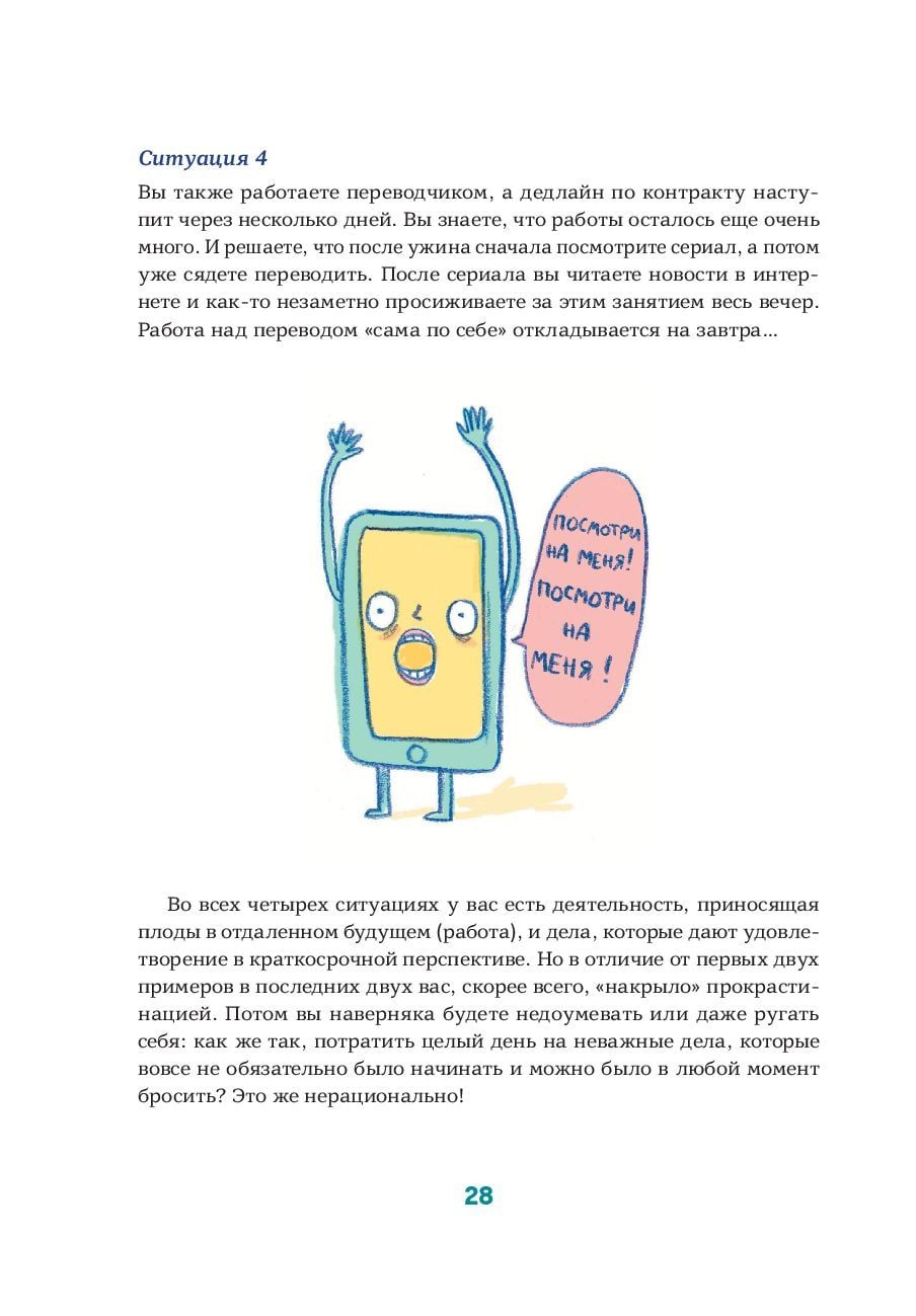 Такое случается почти со всеми: мы откладываем выполнение неприятных дел и в итоге живем от дедлайна к дедлайну. Почему так сложно противостоять прокрастинации и вовремя включаться в работу? Эта книга, написанная двумя современными нидерландскими психологами, отвечает на многие вопросы: отчего нам так хочется прокрастинировать и почему это свойственно всем людям; почему прокрастинация — это не лень; каковы симптомы прокрастинации, как выявить их у себя... Но главное — как с этим бороться. С помощью простых коротких тестов и упражнений вы научитесь лучше распределять свое время, создавать позитивный рабочий настрой и сохранять мотивацию для выполнения трудных проектов и неприятных дел, которые так и тянет отложить в долгий ящик.