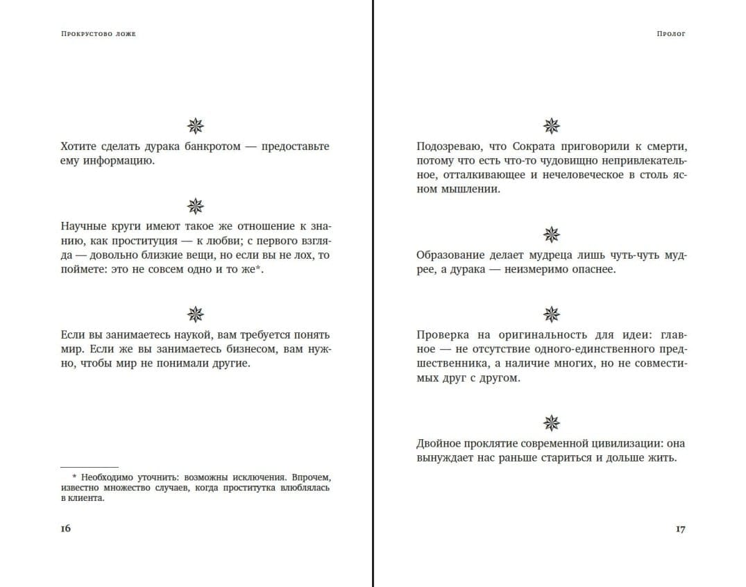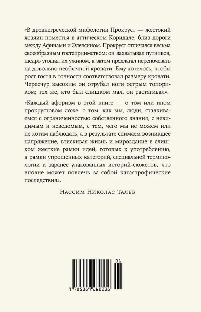 Собрание афоризмов Нассима Талеба не случайно получило такое название. Как объясняет сам автор: «Каждый афоризм в этой книге — о том или ином прокрустовом ложе: о том, как мы, люди, сталкиваемся с ограниченностью собственного знания, с невидимым и неведомым, с тем, чего мы не можем или не хотим наблюдать, а в результате снимаем возникшее напряжение, втискивая жизнь и мироздание в слишком жесткие рамки идей, готовых к употреблению, в рамки упрощенных категорий, специальной терминологии и заранее упакованных историй-сюжетов, что вполне может повлечь за собой катастрофические последствия».