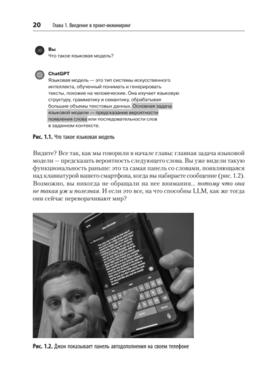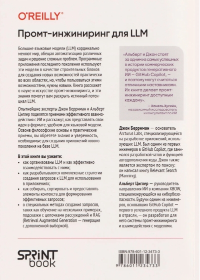 Большие языковые модели (LLM) кардинально меняют мир, обещая автоматизацию различных задач и решение сложных проблем. Программные приложения последнего поколения используют эти модели в качестве строительных блоков для создания новых возможностей практически во всех областях, но, чтобы пользоваться этими возможностями, нужны навыки. Книга расскажет о науке и искусстве промт-инжиниринга, и эти знания помогут вам раскрыть истинный потенциал LLM.